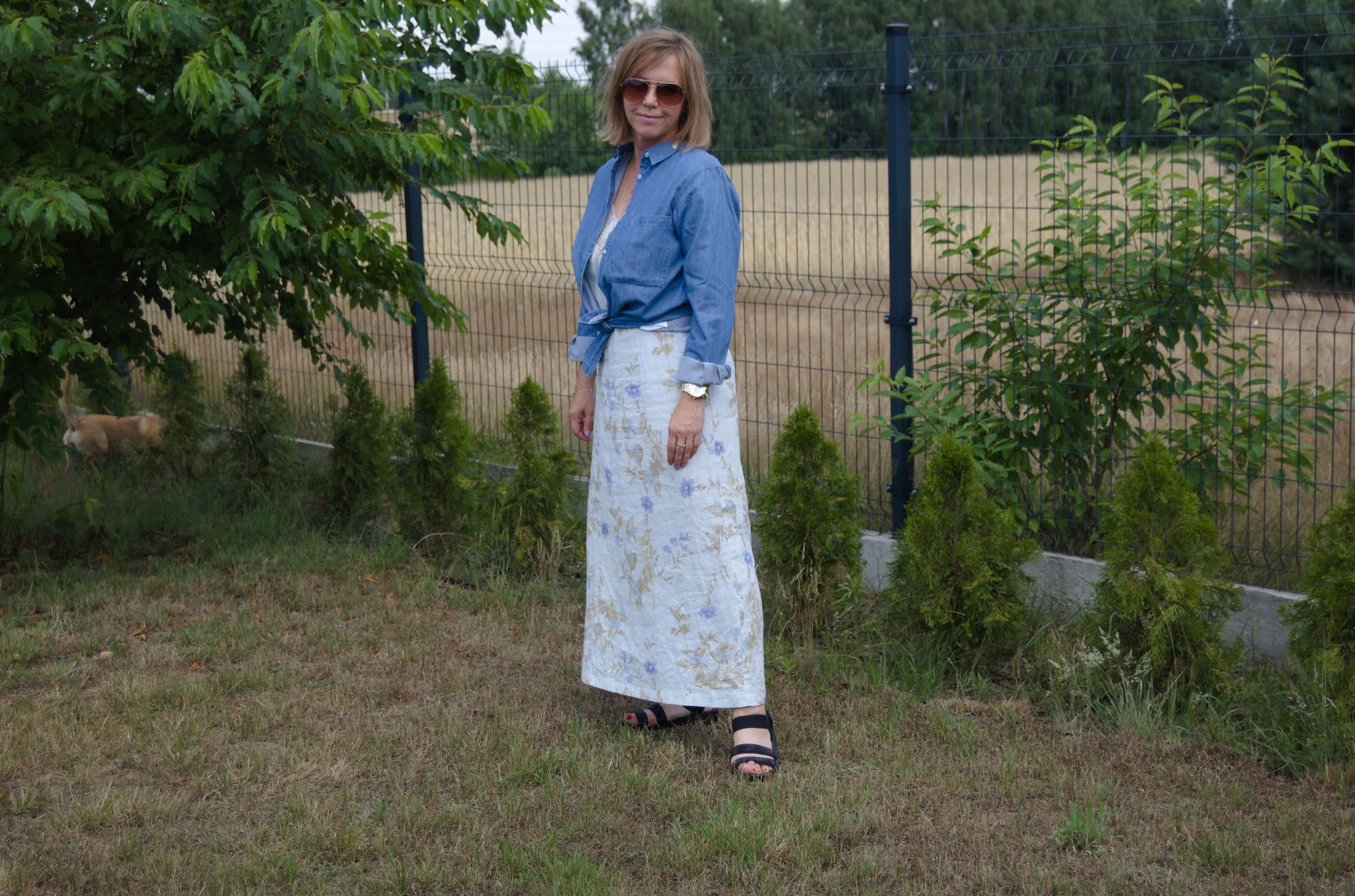 Drugi zestaw, to długa sukienka w delikatne kwiaty, w rozbielonych niebieskościach i zieleniach w odcieniach oliwki. Do tego lekka niebieska koszula zawiązana w pasie. Kolczyki liście, wisiorek, bransoletki, zegarek w odcieniach złota i okulary jako dodatki. Złote dodatki latem bardziej mi podchodzą. Oczywiście wygodne, płaskie sandały. Denimowa koszula oraz sukienka wypatrzone w sh. Potrójny złoty wisior pochodzi z H&M.