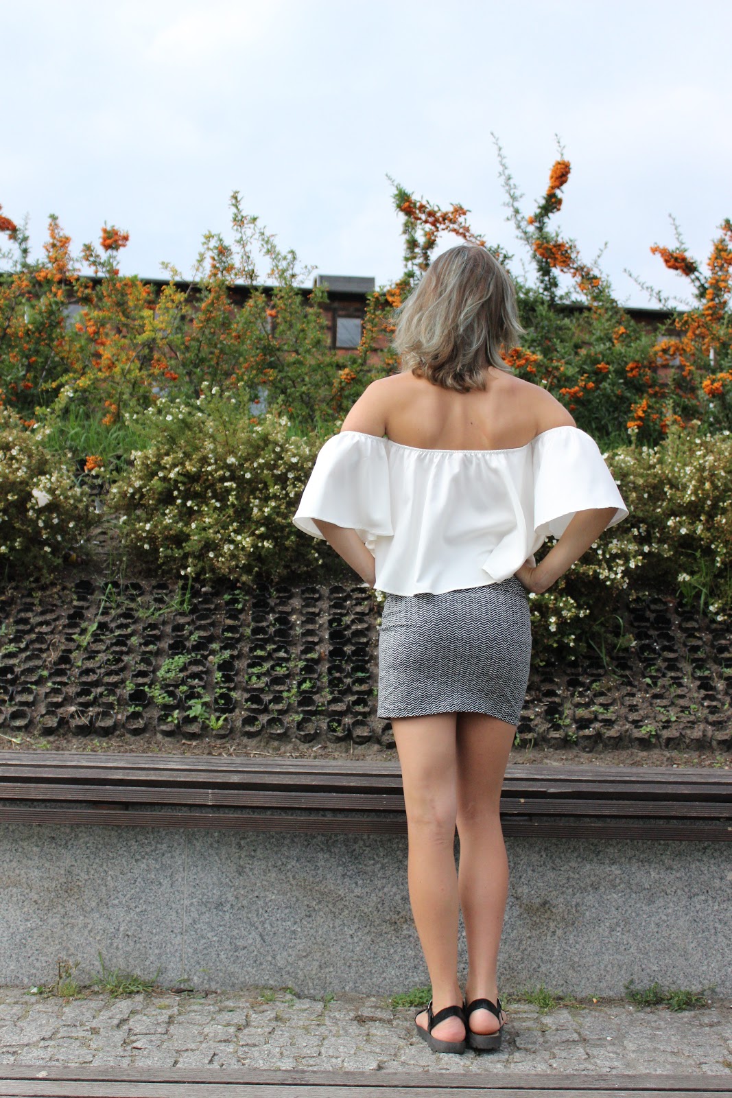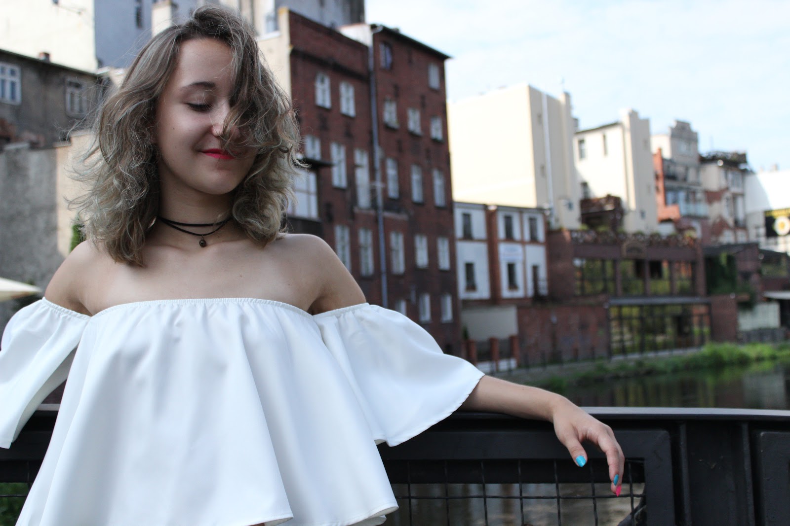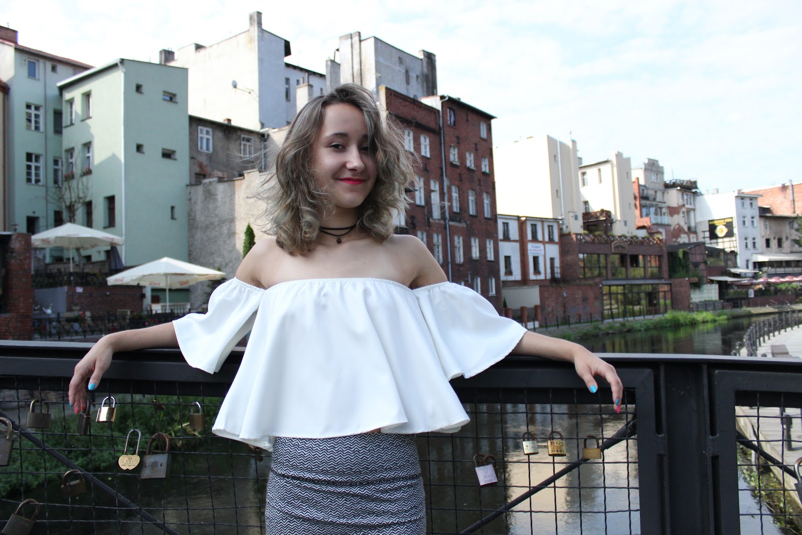 Bardzo długo planowałam zdjęcia w tej stylizacji, lecz nigdy nie udawało mi się trafić na pogodę idealną. Głównym punktem całego outfit'u jest bluzka typu "Hiszpanka" z odsłoniętymi ramionami, które były hitem tego lata. Ich ceny w sklepach były dość wysokie, bo często przekraczały 60-70 złotych. Jak zwykle, w poszukiwaniu tańszej alternatywy odwiedziłam mój ulubiony sklep internetowy - Aliexpress.com. Udało mi się znaleźć tę białą perełkę za niecałe dwadzieścia złotych!