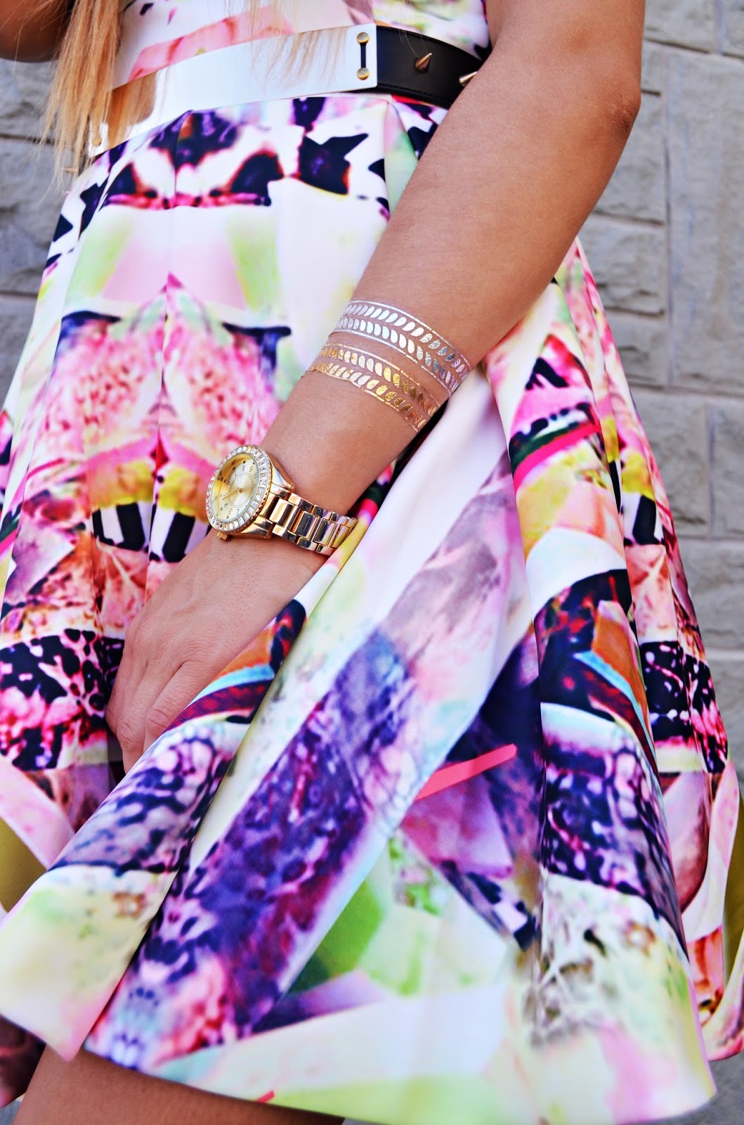 Zobacz oryginał pon., 24/08/2015 - 21:00Witam:) Dzisiaj prezentuję Wam zestaw w przepięknej kolorowej sukience w roli głównej. Od jakiegoś czasu goszczą u mnie głównie biel, szarość i czerń. Jednak tej sukience nie mogłam się oprzeć i musiała znaleźć się w mojej szafie. Dodatkowo jej jakość jest naprawdę świetna w stosunku do niskiej ceny. Do całości dobrałam złoty pasek, pastelowe szpilki, różowe lustrzanki oraz złoty zegarek i złote tatuaże na rękę (które są hitem tych wakacji). Dużo się dzieje, o co mi właśnie chodziło:) Lato nie odpuszcza, a pogoda jest świetna, dlatego nie rezygnuję jeszcze z wakacyjnych zestawów. Chcę nacieszyć się słońcem i upałami jak najdłużej, bo w rejonie w którym mieszkam zima trwa niestety dłużej - taki urok gór:) Przypominam o instagramie @balaczka oraz o nowym snapchacie dodawajcie: balaczka :)