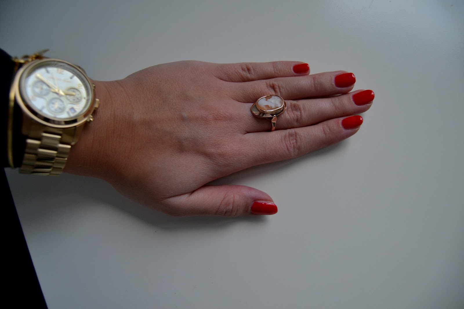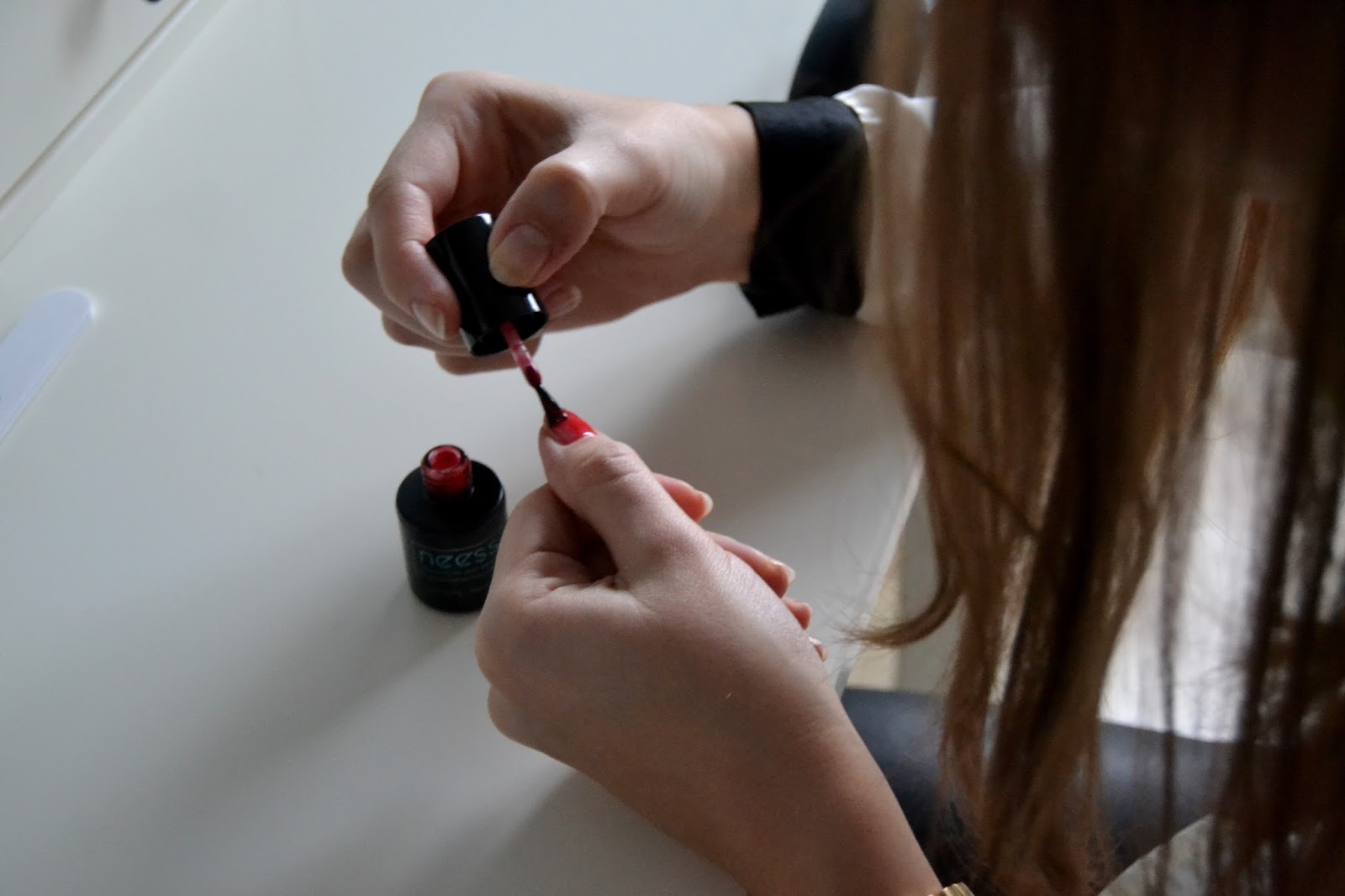 7. Nałożyłam jedną, cienką warstwę lakieru hybrydowego - "czerwony i wściekły" - utrwaliłam w lampie dwa razy po 90 s.