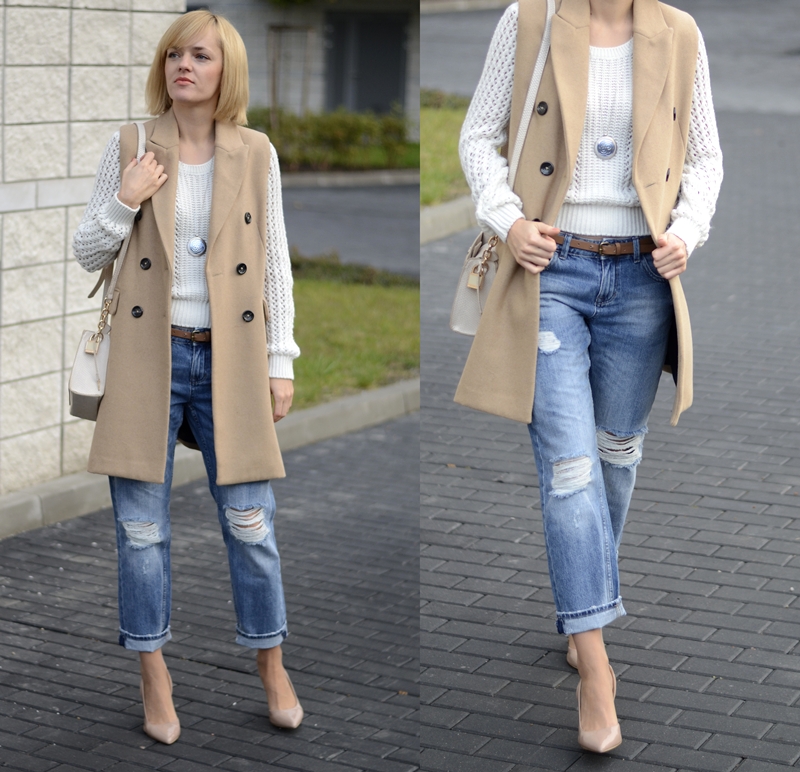 albo w zimniejsze dni, skórzana kurtka :-) Jeżeli chodzi o swetry, to białe z widocznym splotem są hitem sezonu!
