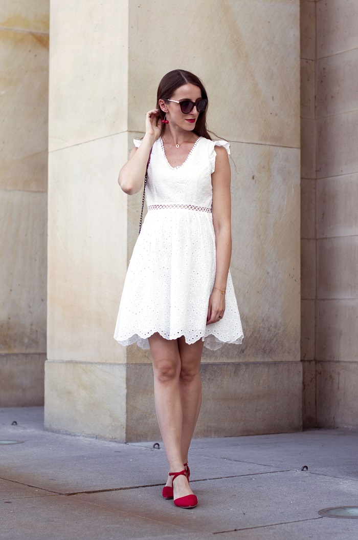 Przyznam, że ten rodzaj sukienek zawsze wydawał mi się mało praktyczny - delikatne, haftowane materiały szybko się brudziły, więc często po jednym założeniu nadawały się już do prania. Gdy nadciągnęła fala upałów spojrzałam na nie nieco przychylniejszym okiem. Choć w mojej garderobie dominują trzy kolory: czarny, biały i czerwony (i najchętniej na co dzień chodziłabym tylko w czerni), to gdy temperatura rośnie, rosną też notowania jaśniejszych barw. A im lżejsza i bardziej przewiewna tkanina, tym lepiej. W pierwszej wersji zestawiłam ją z czerwonymi, dodatkami: małą torebką, wygodnymi czółenkami na słupku oraz wiszącymi kolczykami hand-made. Jeszcze tylko delikatny akcent na usta i mamy gotową subtelną i elegancką stylizację na letnie wieczory.