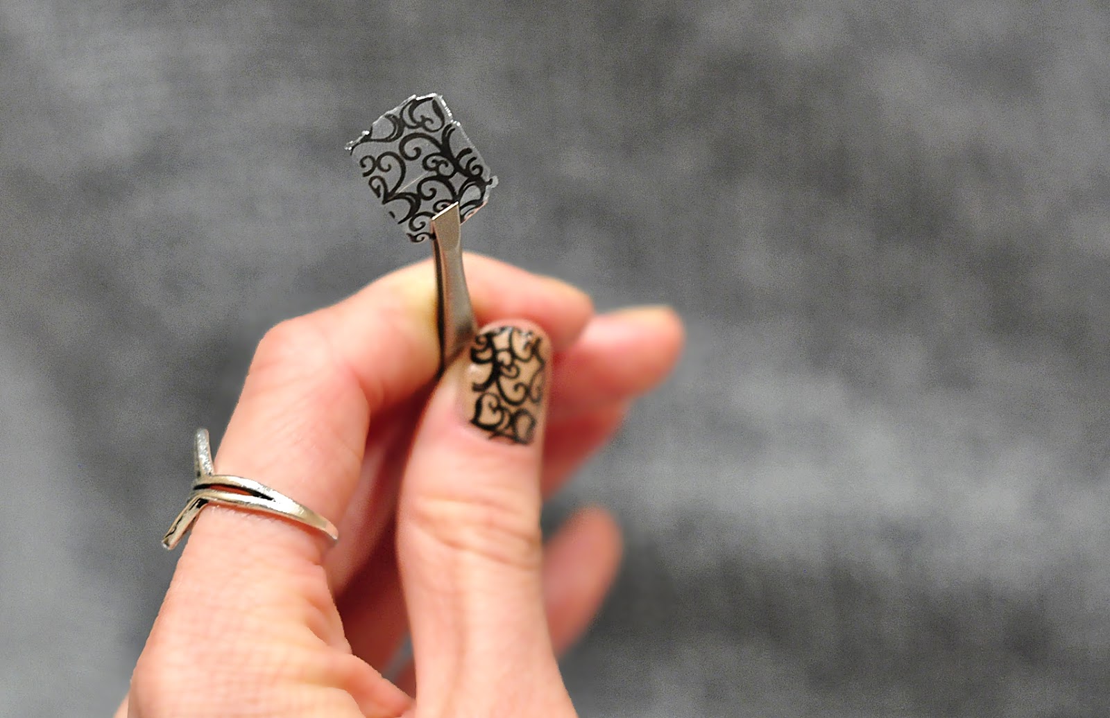 Umieszczamy naklejkę na paznokciu, przycinamy jej nadmiar wystający poza płytkę i ot cała filozofia. Widzicie, że zabawy nie ma przy tym dużo, a efekt jest naprawdę ciekawy.