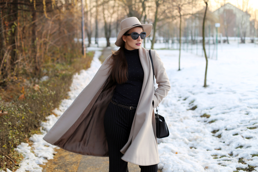 Płaszcz: STEFANEL o Spodnie: TUTAJ o Golf: H&M o Botki: TUTAJ o Listonoszka: MICHAEL KORS o Okulary: DOLCE & GABBANA o Pazury: TUTAJ o Kapelusz: F&F