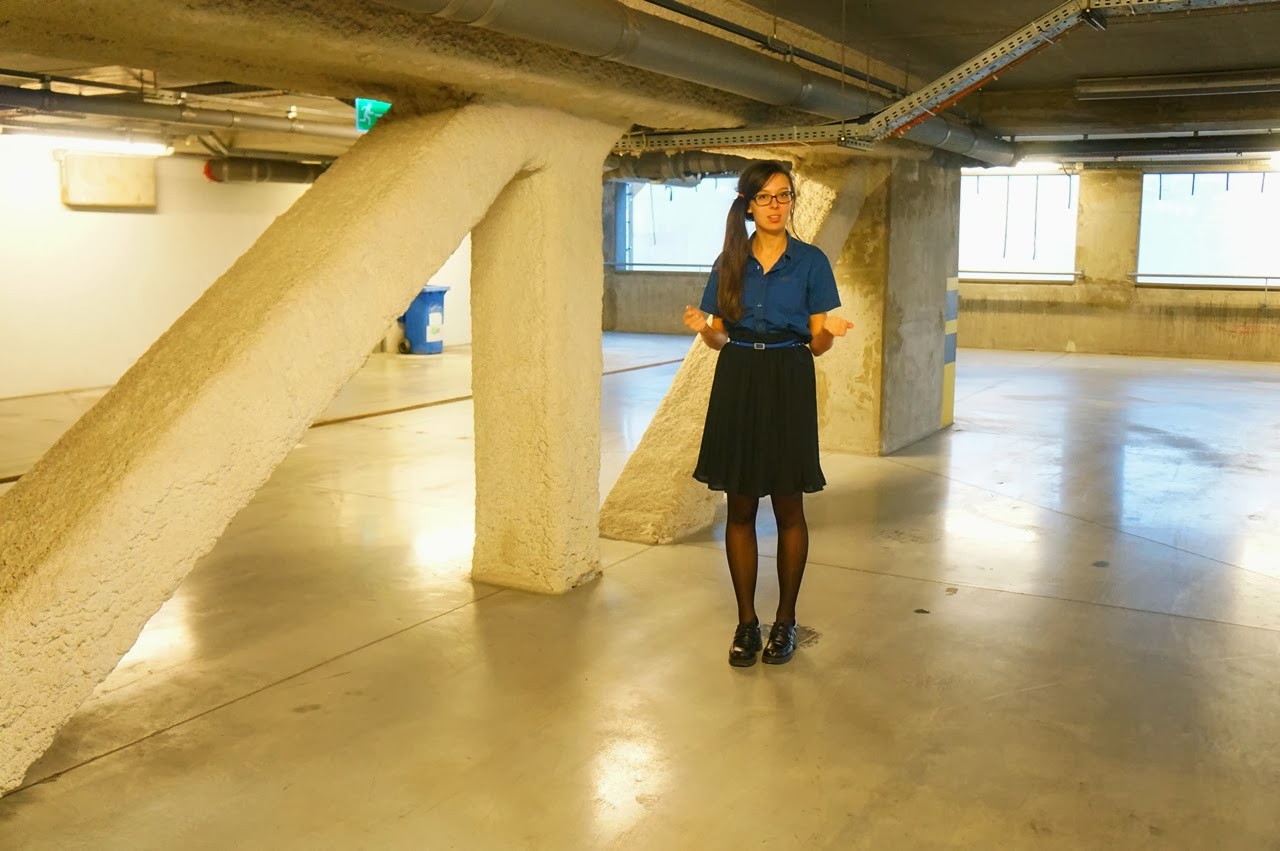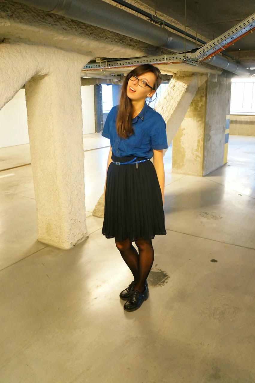 Niebieska koszula+plisowana czarna spódnica.