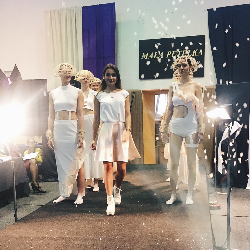 Przechodząc jednak troszkę do kwestii moich przeżyć i zmagań z samą sobą, nie nazwałabym tego konkursu inaczej jak wyzwania, szczególnie jeśli za cel stawiamy sobie tak jak ja 7 sylwetek, a nawet więcej. Trafił mi się okres dosyć krótki na wykonanie tego, miałam ferie i byłam chora. Wiele czasu poświęciłam, nie raz siedziałam po 10h w szkole i szyłam. Przez cały konkurs byłam bardzo przemęczona i nie spodziewałam się, że to może aż tak zmęczyć. Gdy po jakimś czasie zaczęłam widzieć efekty wszystko zaczęło mi się nie podobać i tak na prawdę na wszystko patrzyłam pesymistycznie. No ale kolekcja skończona więc czas jechać do Poznania. W dzień konkursu gdy moje modelki wszystko na siebie założyły i wyszły na wybieg byłam zdenerwowana, ale zachwycona efektem. Wyglądały zniewalająco, robiły taki efekt jak chciałam. Gdy na koniec wyszłam się ukłonić czułam się bardzo dumna.