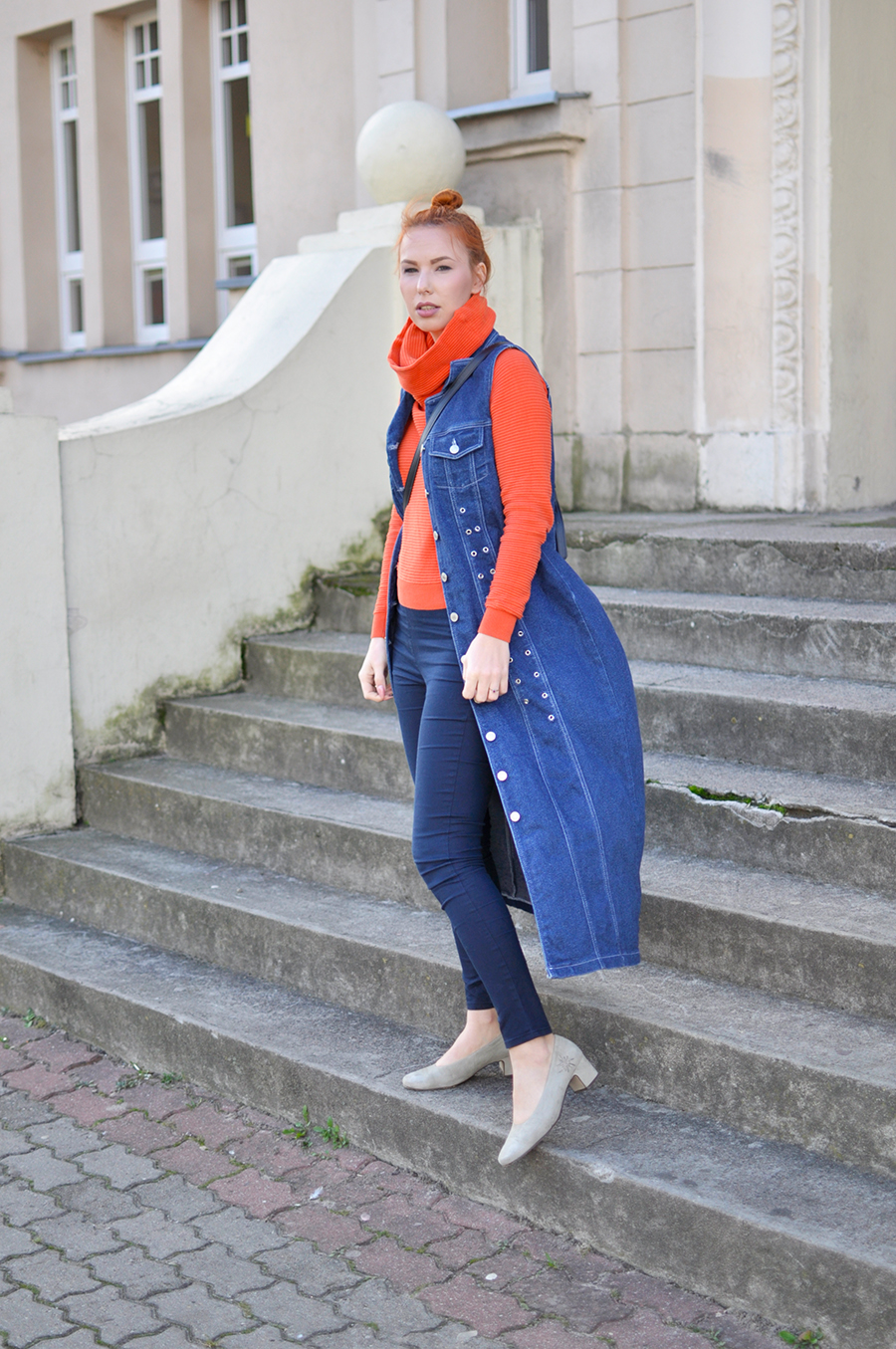 Dzisiaj mam dla Was propozycję jeansowego looku, rozświetlonego przez pomarańczowy golf. Najpierw wpadł mi w oko jeansowy płaszcz. Szukałam go jakiś czas i nie znalazłam nic, co by mi w 100% odpowiadało. Pewnego pięknego dnia w ciucholandzie znalazłam tę długą kamizelkę. Okazało się, że dokładnie tego potrzebowałam. Taki element wygląda świetnie z dopasowanymi rurkami, czyli w zestawie, który dziś Wam prezentuję, ale będzie wyglądać dobrze też z spodniami typu dzwony. Taki zestaw z pewnością także się tu pojawi.