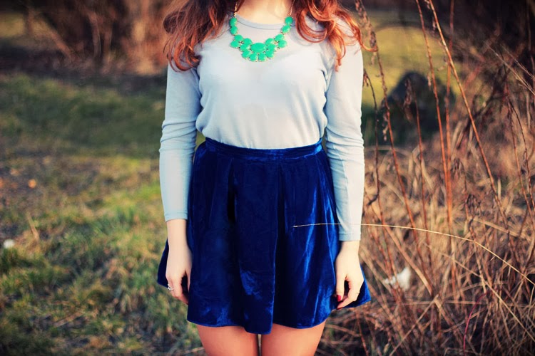 I'm so happy, that it's getting warmer. I hope, that from day to day will be better. Doing almost spring's cleaning in my wardrobe, I encountered on my velvet skirt, which about I have totally forgotten. I wore it rarely, but I regret it, cause it's awesome. I'm trying to have a good mood and positive attitude, cause in other way I could go crazy. Honestly saying I recommend it everyone, cause it's the best medicine for days, in which without shovel don't approach. Several people said me one time, that I must start enjoying the moment and don't think about the future and worry about it. The most valuable is this moment, cause it builds future, well used affect for our future for sure. Remember those words! Kisses!