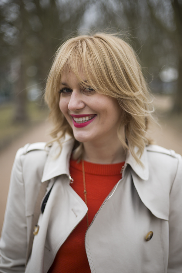 Dzisiaj próbuję ożywić odchodzącą zimę (taką mam nadzieję) odrobiną pomarańczy. Dzianinowa sukienka w tym dość trudnym kolorze, z metką Marks & Spencer, pochodzi z second handu i stanowi mój najnowszy nabytek. Kolor pomarańczowy jest soczysty, ożywia każde zestawienie i nadaje mu radosnej nutki. Nie lubi konkurencji. Jeżeli decyduję się na sukienkę w tak odważnej barwie pozostałe części garderoby pozostawiam w stonowanej kolorystyce. Jeżeli macie jakieś ubrania w kolorze pomarańczowym i nie macie pomysłu jak je nosić to odsyłam Was tutaj, po małą dawkę inspiracji.