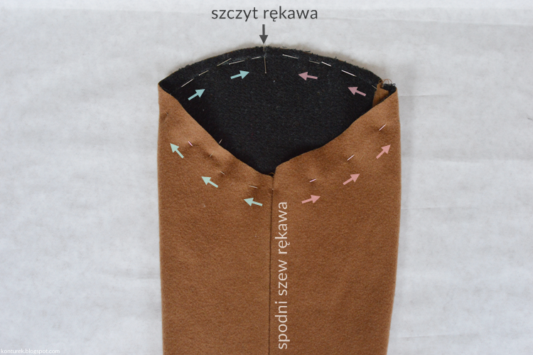 Ja zapasy podłożenia rękawa przyszywam ręcznie tylko w miejscach stykania się ze sobą ich szwów (wierzchnich i spodnich).