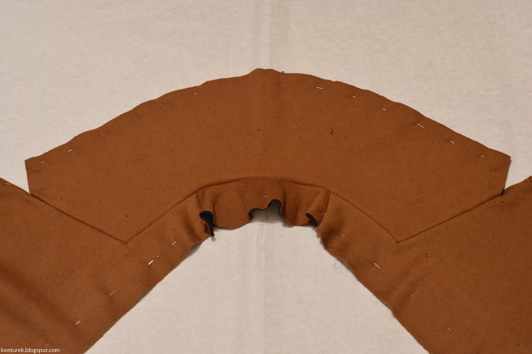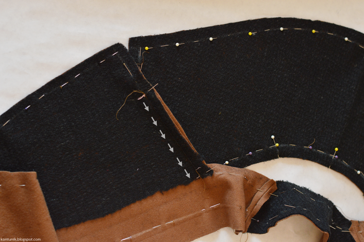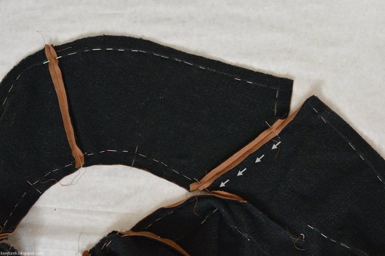 Podobnie jak z zapasami nasady wierzchu kołnierza, nie obcinam zbytnio ich nadmiaru. Zapasy rozprasowuję i nacinam wzdłuż nasady kołnierza jak na zdjęciu, by swobodnie się układały. Zaszewki są płasko zaprasowane.