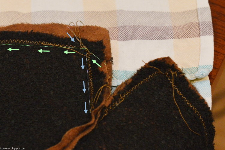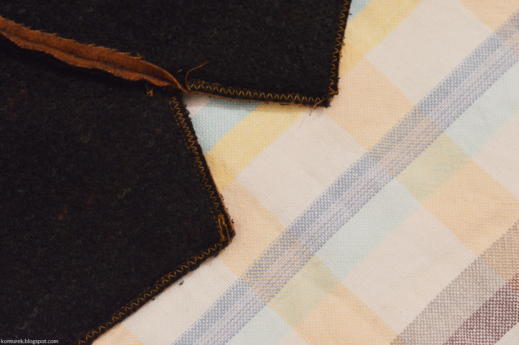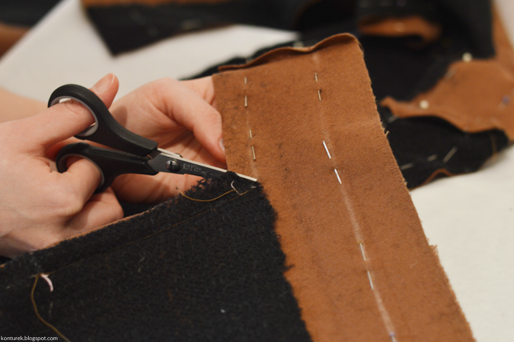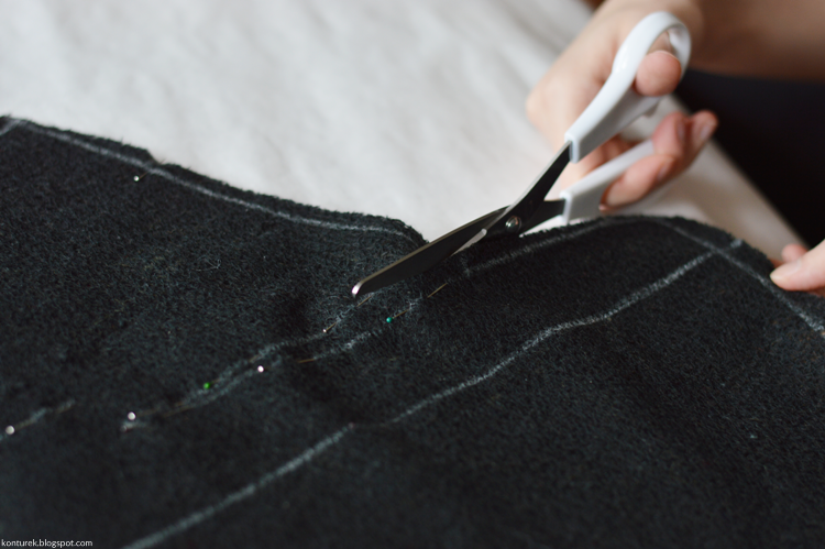 Obcinam nadmiar zapasów, robię dodatkowe nacięcia na rogach dolnych brzegów (ukośne; niestety nie mam zdjęcia), kołnierza i rewersów.