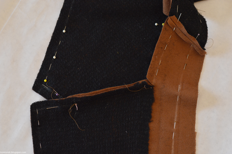 Dopiero tak zszyte części przypinam i fastryguję prawą stroną do prawej reszty płaszcza wzdłuż jego przednich brzegów, rewersu i kołnierza (jak opisałam wyżej w sposobie nr 1):Najpierw fastryguję przednie brzegi.