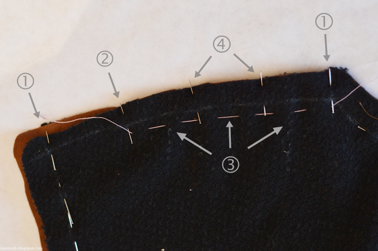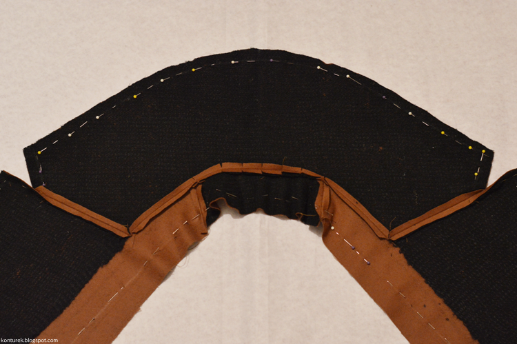 Na kołnierz składa się wierzch i spód (mój spód kołnierza składa się dodatkowo z dwóch części, zszytych w linii pośrodkowej – efekt braku wystarczającej ilości materiału). Na częściach kołnierza zaznaczone mam szpilkami punkty pomocnicze, które są miejscem styku ze szwami ramion (1). Wewnętrzny brzeg kołnierza stanowi nasadę kołnierza.