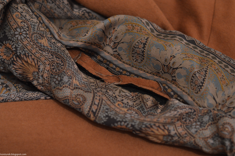 Pasek skroiłam z brzegu tkaniny, no niby dobrze, niby zgodnie z kierunkiem materiału, ale dopiero po jego przyszyciu do płaszcza zauważyłam na jego prawej stronie przejaśnienie po fabrycznym zagięciu, które prasowałam w ciemny listopadowy wieczór. Spoko, myślę sobie, przyszyję pasek do góry nogami. Niestety przeciwny kierunek włosa dał o sobie znać i pasek był po przyszyciu o ton ciemniejszy.