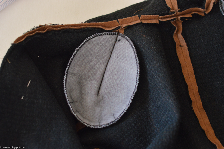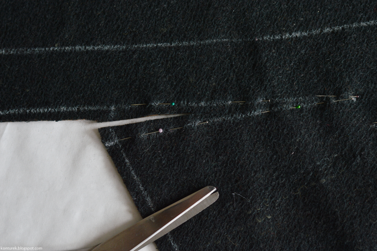 Zawiera w sobie rewers. Warto na odszyciu zaznaczyć linię załamania rewersu (ja zrobiłam to później). Do wewnętrznego brzegu odszycia wszywam podszewkę.
