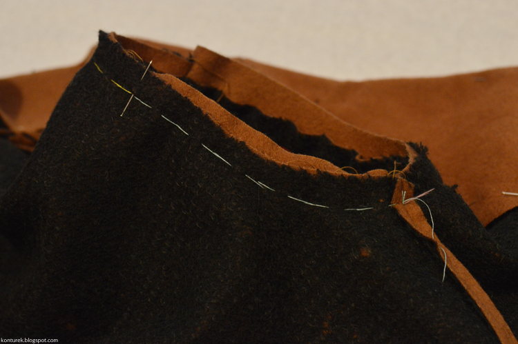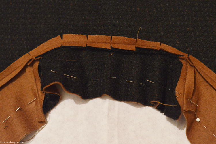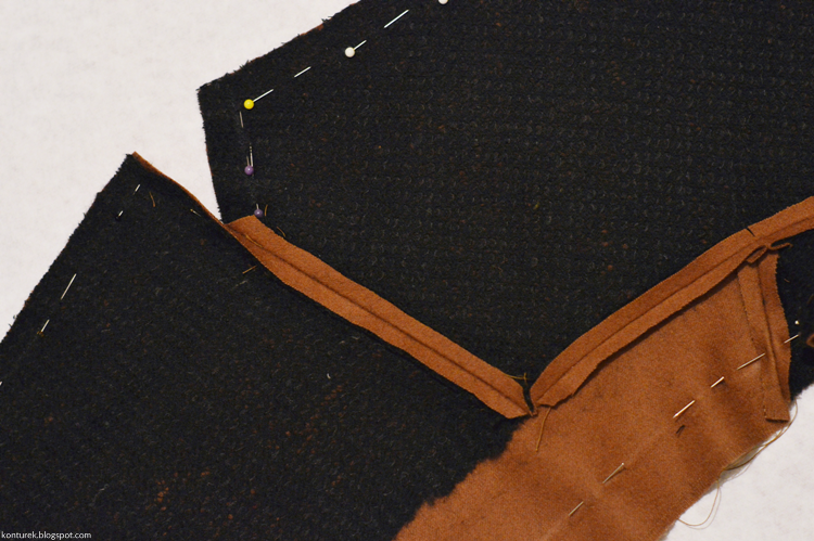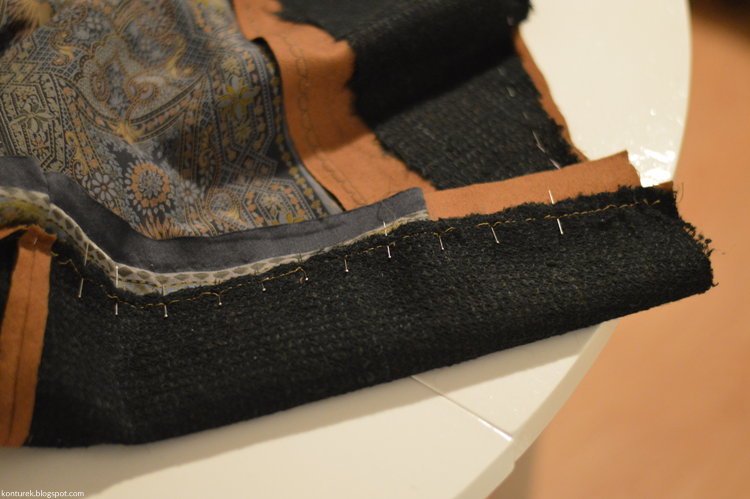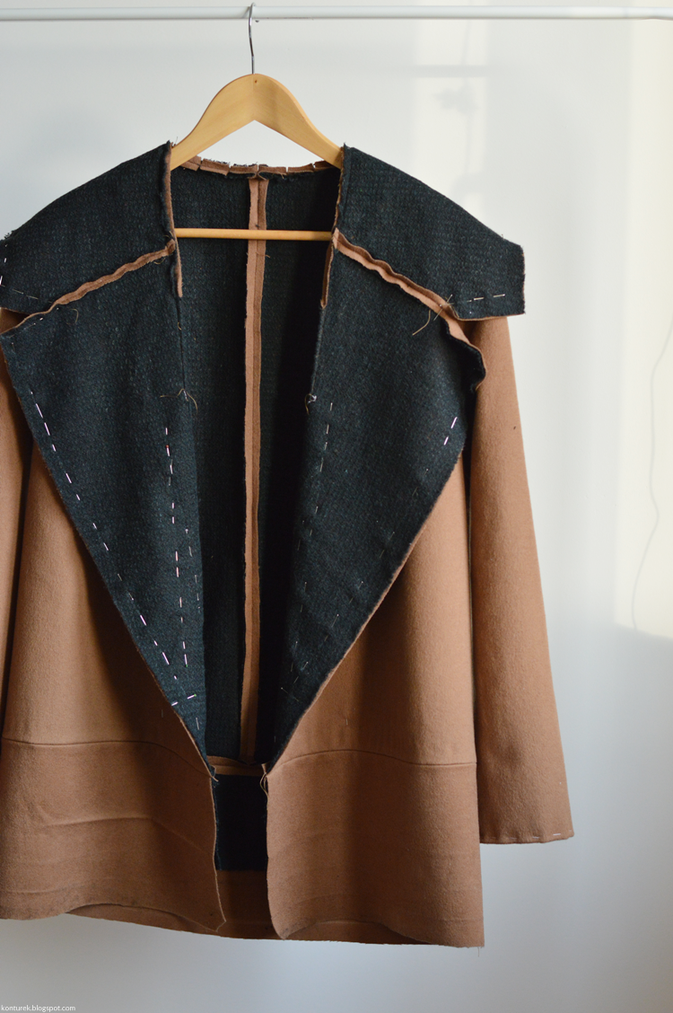 Dopiero tak zszyte części przypinam i fastryguję prawą stroną do prawej reszty płaszcza wzdłuż jego przednich brzegów, rewersu i kołnierza (jak opisałam wyżej w sposobie nr 1):