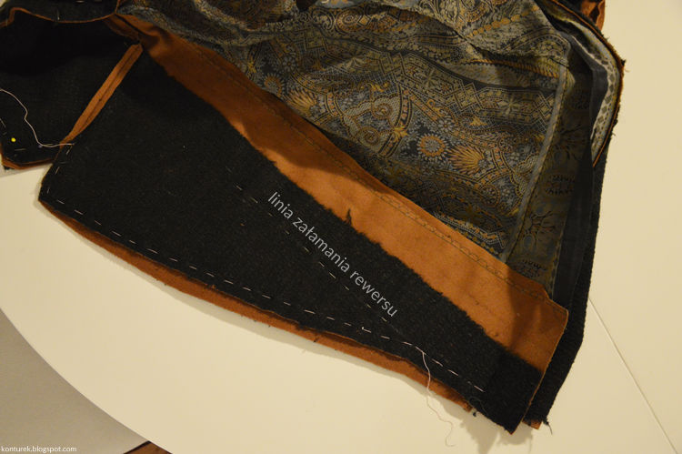 *Mówiąc o rewersie myślę głównie o części odszycia przodu wykładanej na drugą stronę, ale również dla własnego użytku odnoszę się do tej części przodu, która po zszyciu z odpowiadającym jej odszyciem stworzy 'klapę płaszcza'.