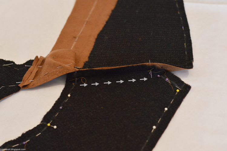 Następnie spód kołnierza przyszywam do przodów w miejscu odpowiadającym podkrojowi szyi. Szycie zaczynam od zewnątrz (od zaznaczonego wcześniej szpilką miejsca styku zewnętrznego brzegu kołnierza z rewersem przodu) do środka, czyli w kierunku rozciętej uprzednio zaszewki. Pokazują to strzałki na zdjęciach poniżej. Wzmacniam szwy ściegiem wstecznym.
