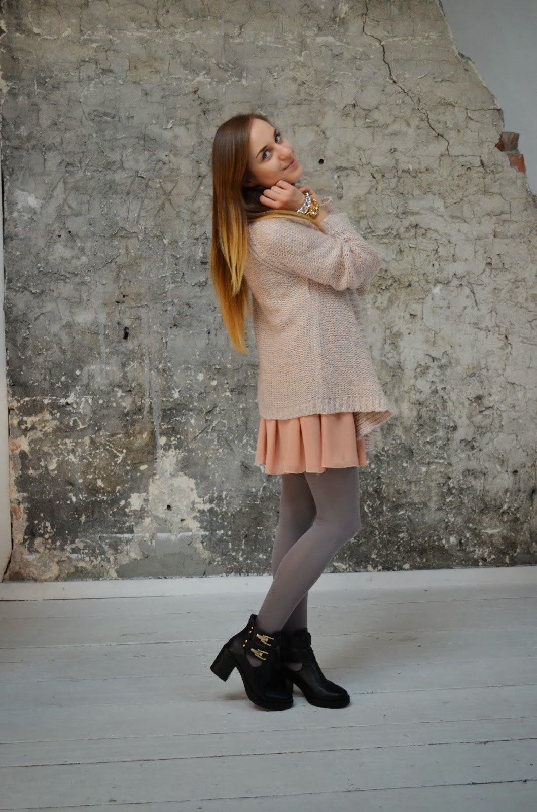 Zobacz oryginał sob., 19/10/2013 - 12:37Jasnoróżowy - w dzieciństwie mój ulubiony kolor, a dzisiaj w mojej szafie są maks 3 rzeczy w tym odcieniu, wciąż królują w niej czerń i biel;) Na zewnątrz szaro, buro, deszcz i wiatr, a mnie nabrało właśnie na takie kolorki. Gdyby nie czarne cięższe buty, było by bardzo słodko (na jesień jestem fanką cięższych butów, nie znajdę u siebie butów na cienkim obcasie). Dodatki złoto-srebrne, podoba mi się to połączenie i będę stosować je dużo częściej, poza tym nie jest takie oczywiste i rzadziej spotykam je na ulicach.