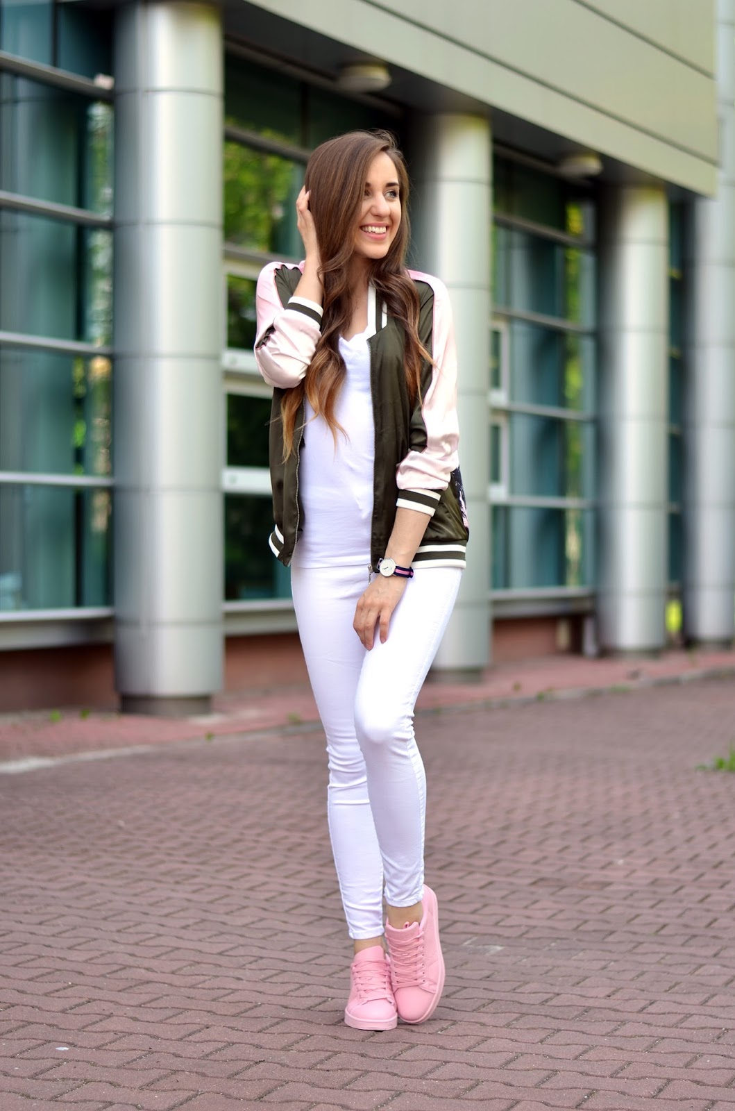 Zobacz oryginał czw., 26/05/2016 - 21:30Witajcie Kochani:) Bluza z palmami ze Stradivariusa jest urocza, od razu wpada w oko i przywołuję na myśl letnie klimaty. W dodatku materiał jest idealny na ciepłe dni jakie ostatnio były w Krakowie. Mi bomber najbardziej podoba się właśnie w zestawieniu z bielą oraz różowymi butami, które są bardzo wygodne. Przybywa mi coraz więcej rzeczy w odcieniach pudrowego różu - uwielbiam ten kolor, a każdy zestaw z jego udziałem wygląda bardzo dziewczęco.