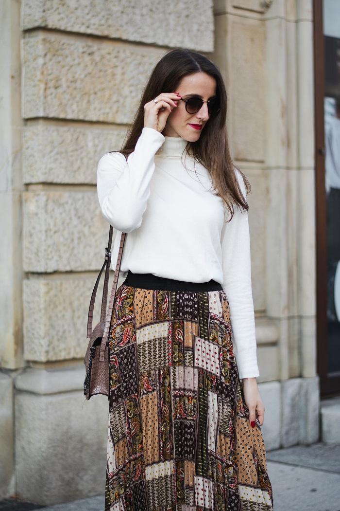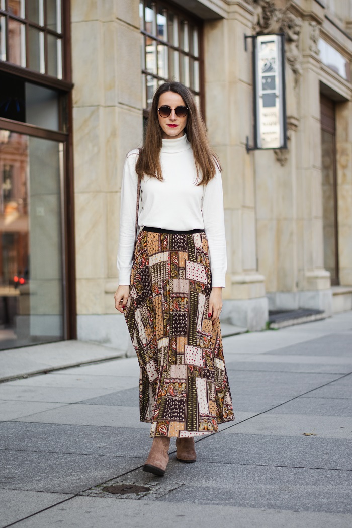 Ja zostaję przy klasyce. Patchworkową plisowankę połączyłam z kremowym golfem oraz beżowymi kowbojkami. Trochę w klimacie boho, ale za sprawą dodatków - również z nutą elegancji. Nowością w mojej szafie jest też mięciutki golf, który wypatrzyłam niedawno w H&M. Przez długi czas nie robiłam zakupów w tej sieciówce, gdyż sporo ubrań bardzo podupadło na jakości. Ostatnio brand walczy z kiepskimi produktami i w kolekcjach basic można trafić na bardzo udane modele. Uwagę zwracają szczególnie lepiej przemyślane składy i porządne wykończenia, dzięki czemu ubrania po jednym sezonie noszenia nie trafią na śmietnik. Ten model golfu występuje w bardzo neutralnych tonach, posiada ściągacze na rękawach oraz na dole, a do tego jest z bardzo miękkiej i ciepłej dzianiny. Pokochają go wszystkie wielbicielki stylu skandynawskiego i minimalistycznego. A ja rozważam zakup kolejnego koloru ;)