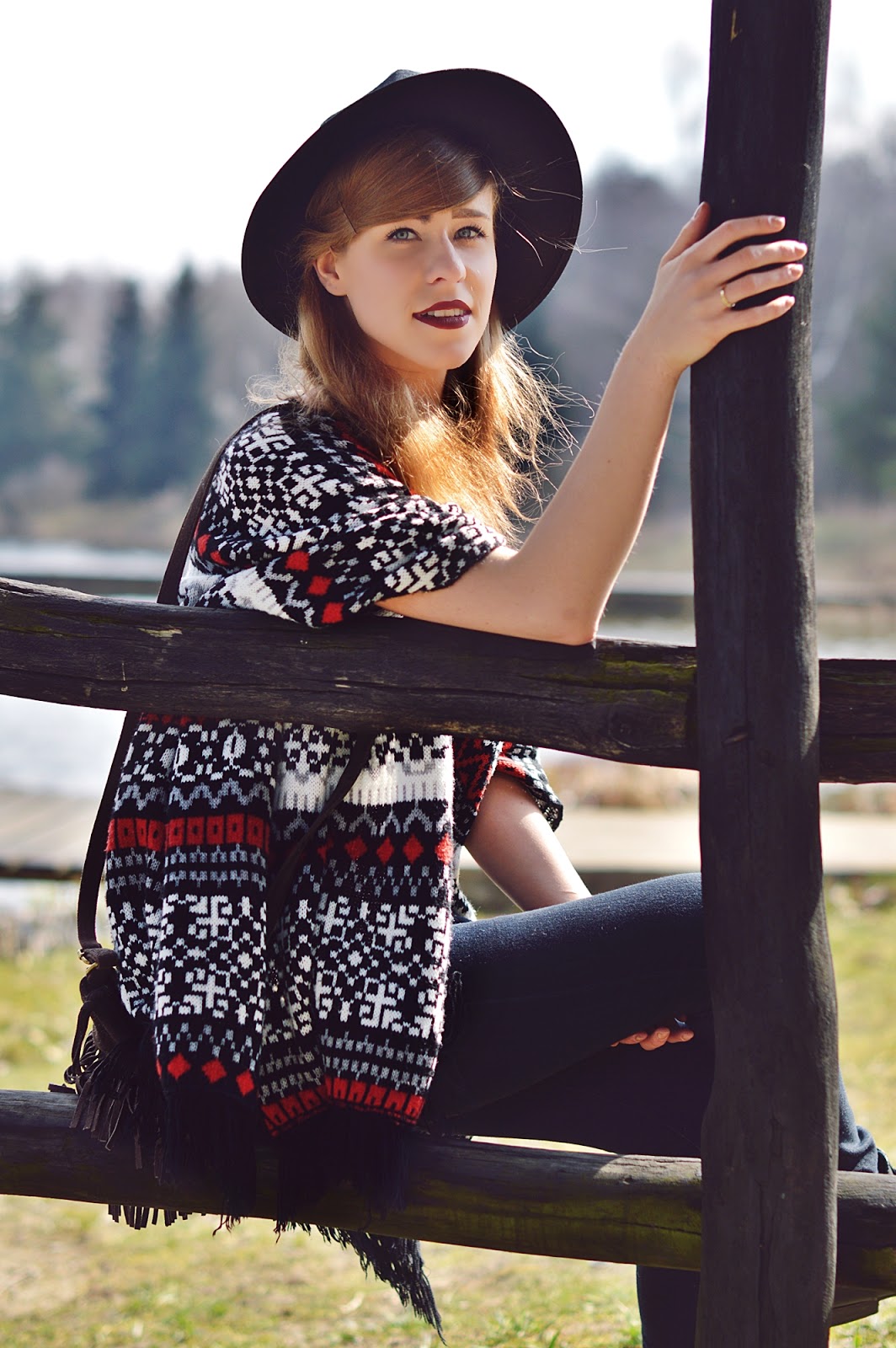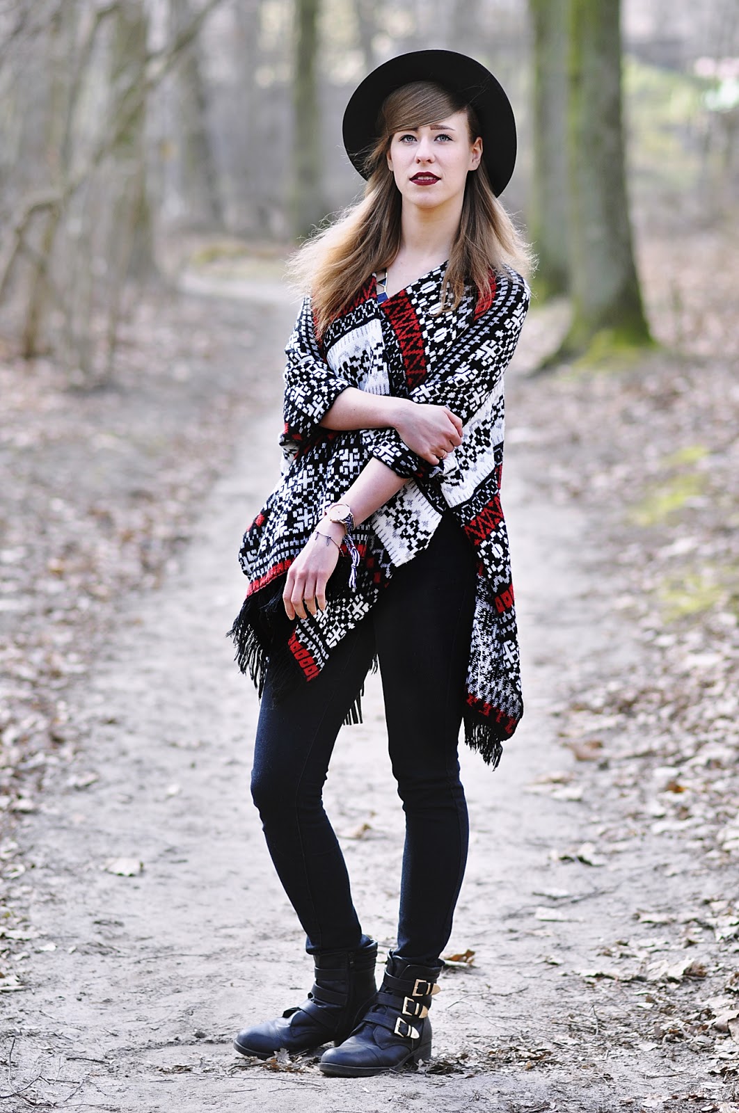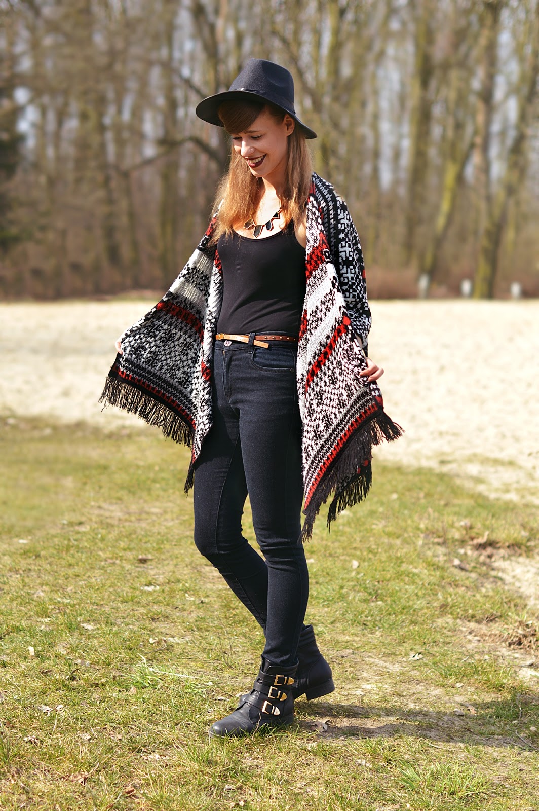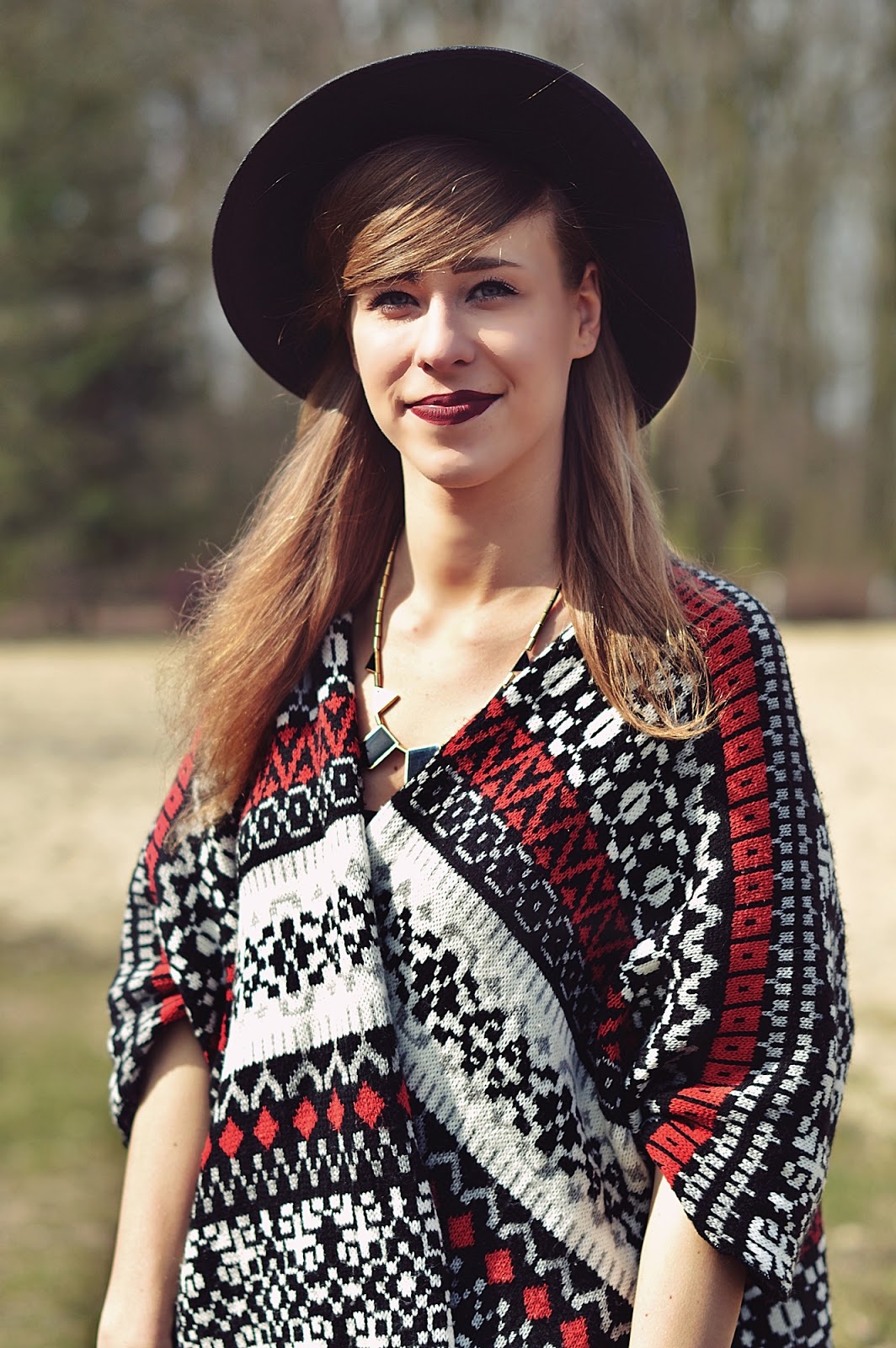 Co do dzisiejszych zdjęć, już od dłuższego czasu nie mogłam doczekać się, aż pogoda pozwoli mi na wrzucenie na siebie tego upolowanego w lumpeksie swetra podszywającego się pod ponczo. Ma świetny krój, piękne kolory i wzór przywodzący na myśl indiańskie plemiona, od których to swoją drogą ponczo właśnie się wywodzi. Kosztował mnie całe 14 zł (o ile dobrze pamiętam) i jest w stanie idealnym. <3