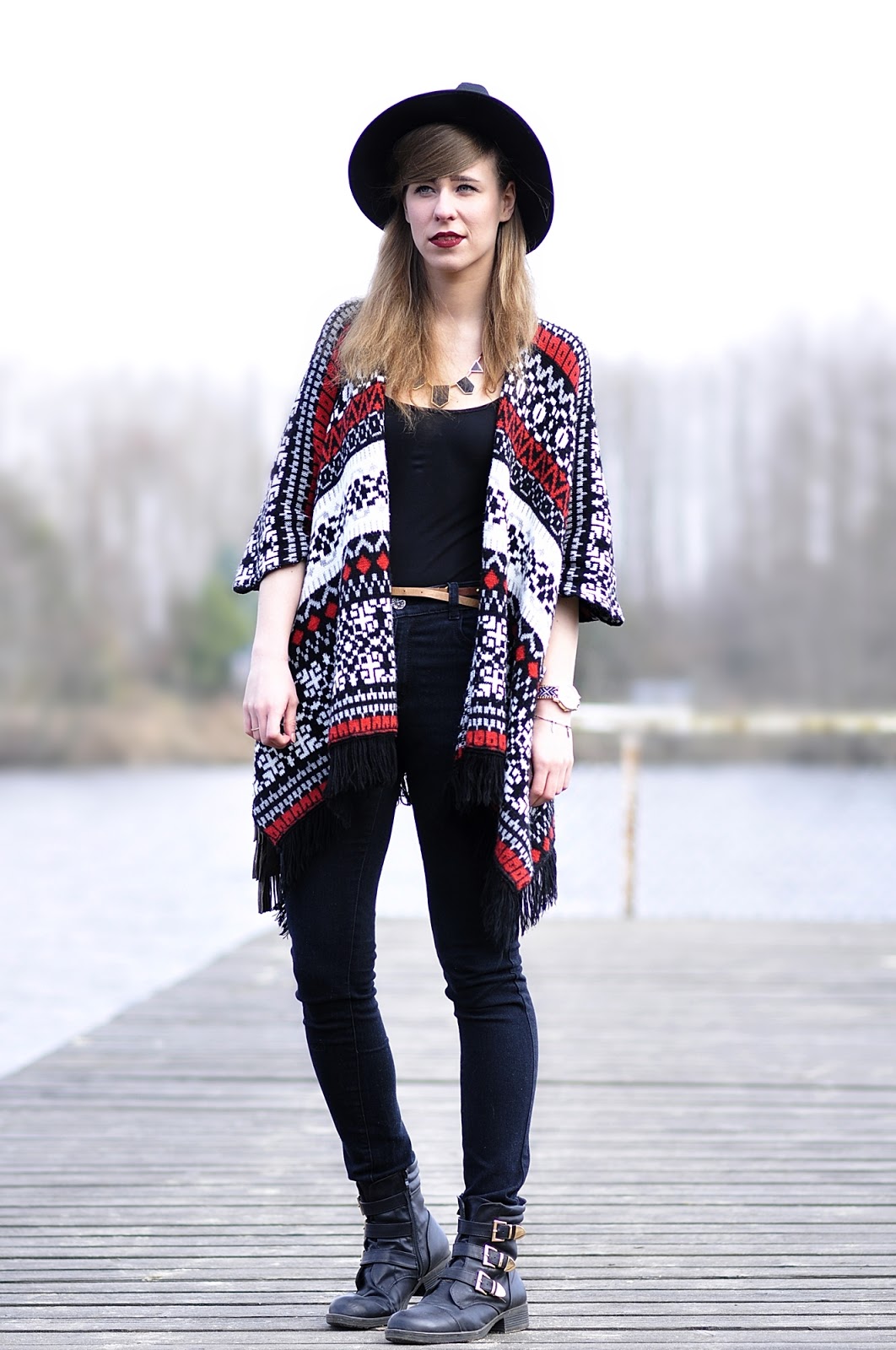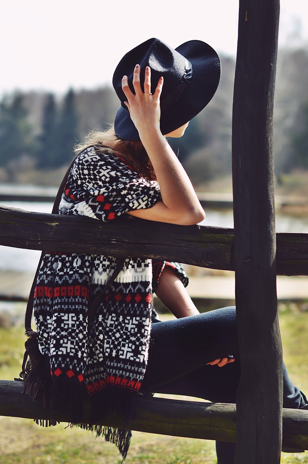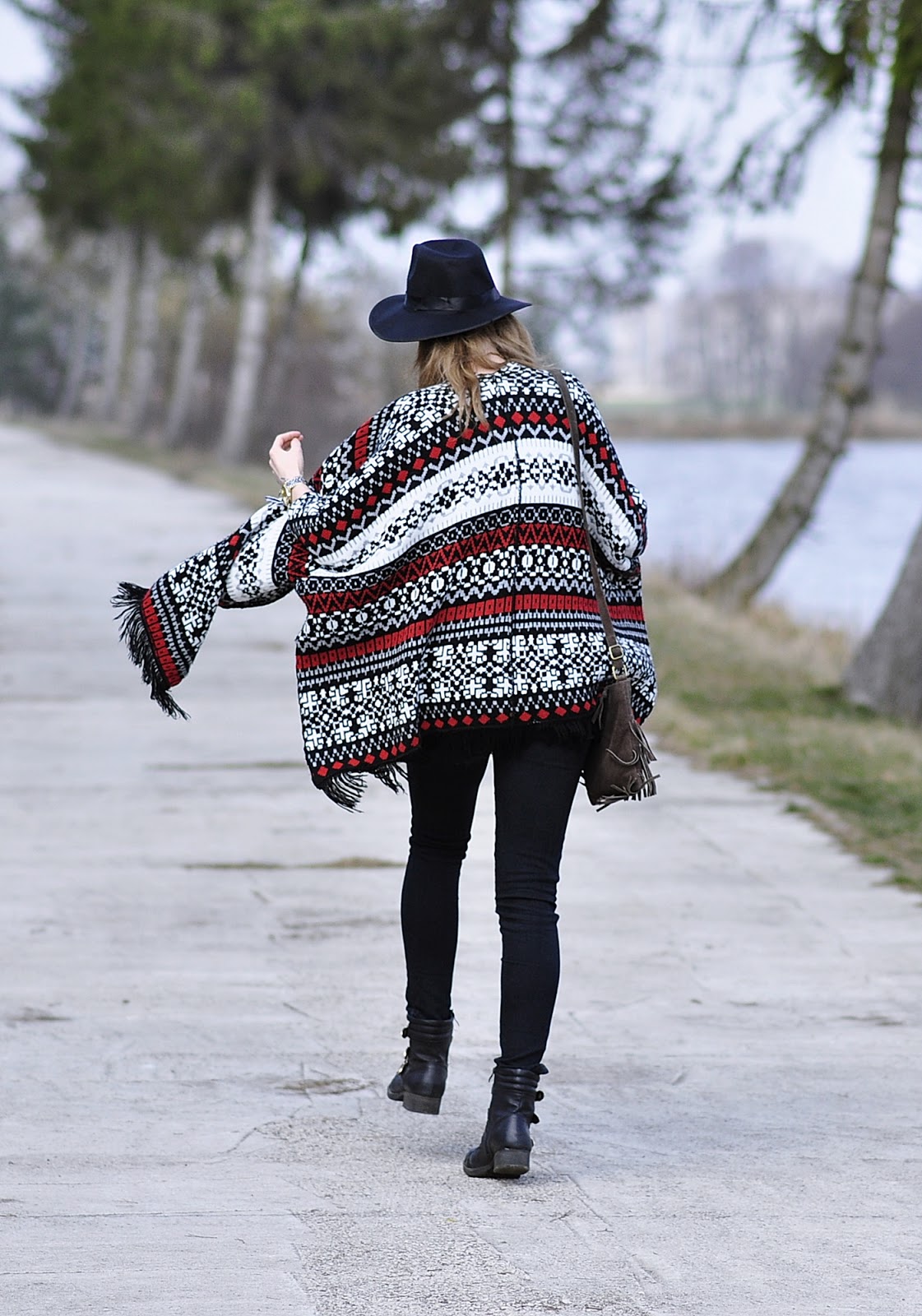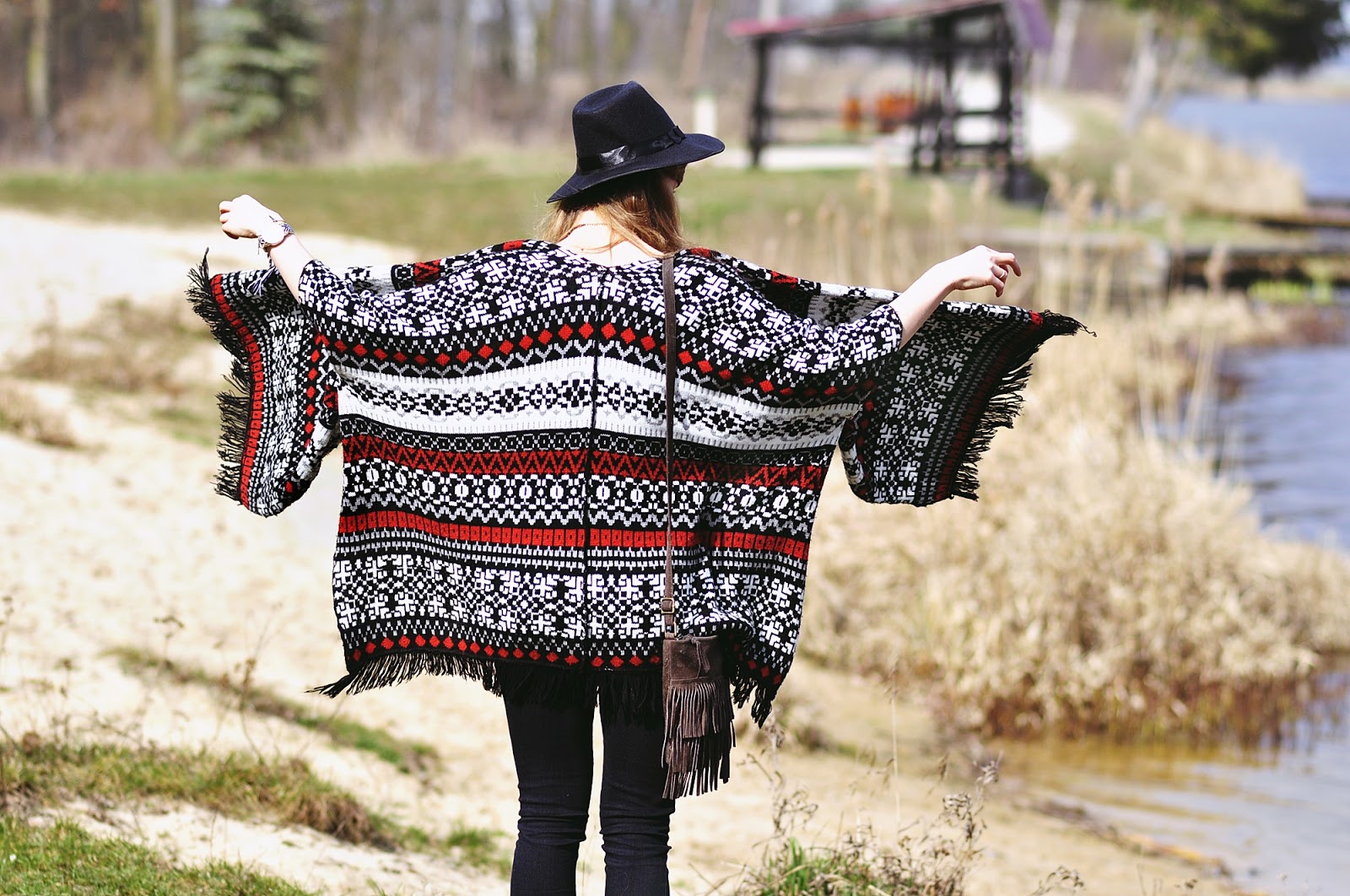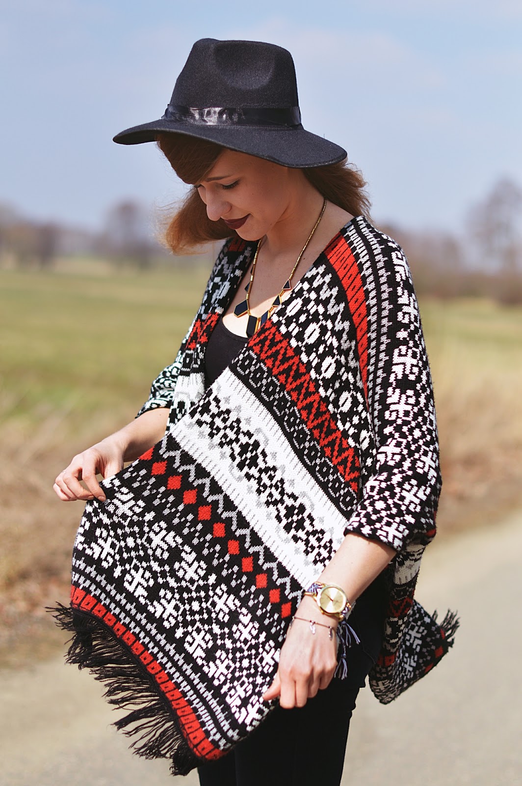 Co do dzisiejszych zdjęć, już od dłuższego czasu nie mogłam doczekać się, aż pogoda pozwoli mi na wrzucenie na siebie tego upolowanego w lumpeksie swetra podszywającego się pod ponczo. Ma świetny krój, piękne kolory i wzór przywodzący na myśl indiańskie plemiona, od których to swoją drogą ponczo właśnie się wywodzi. Kosztował mnie całe 14 zł (o ile dobrze pamiętam) i jest w stanie idealnym. <3