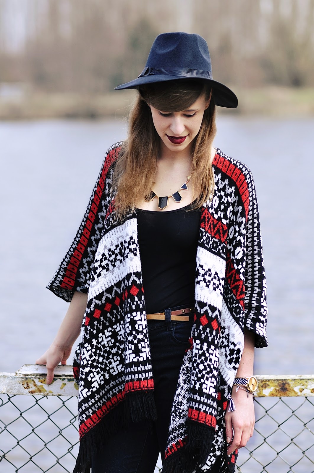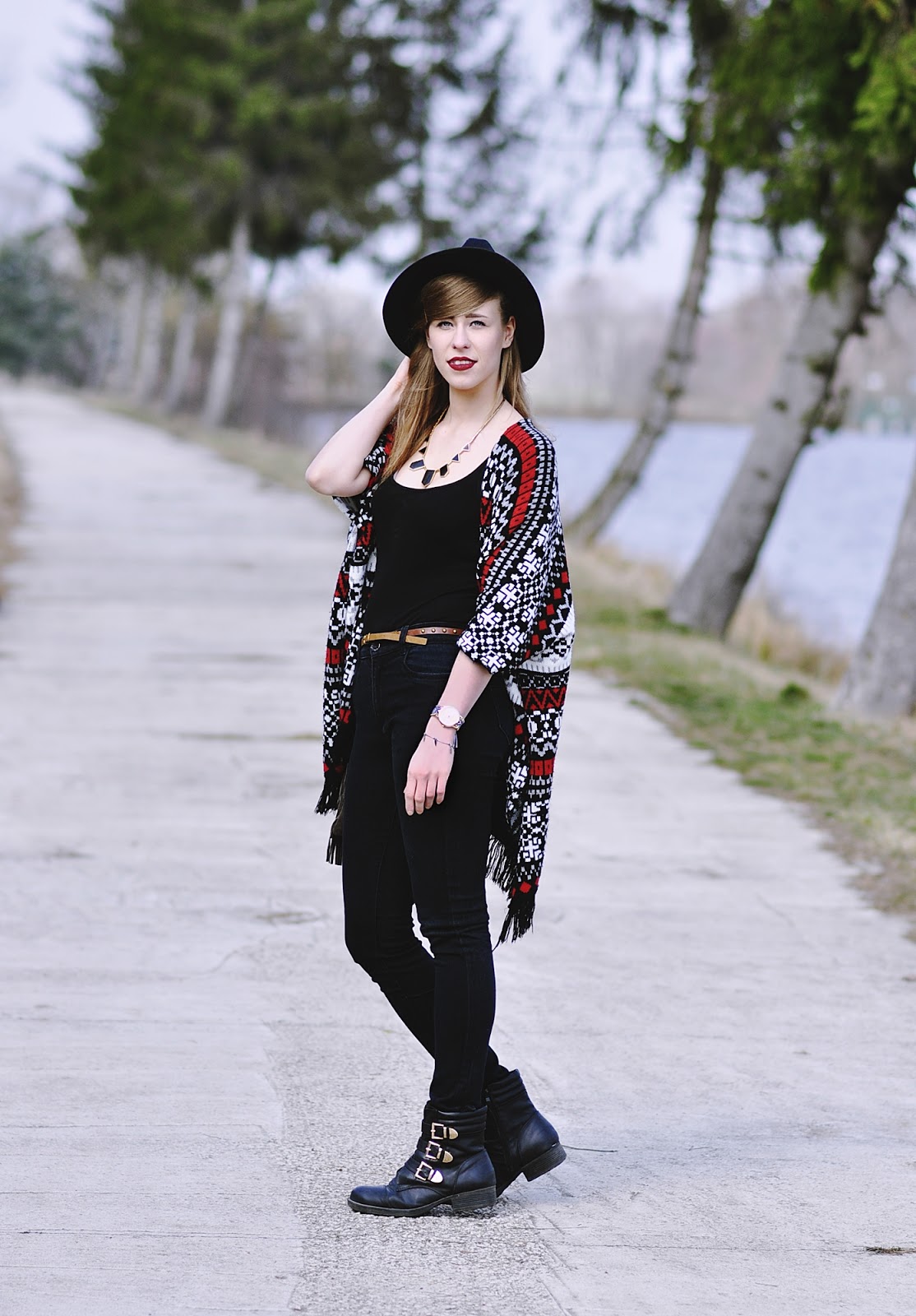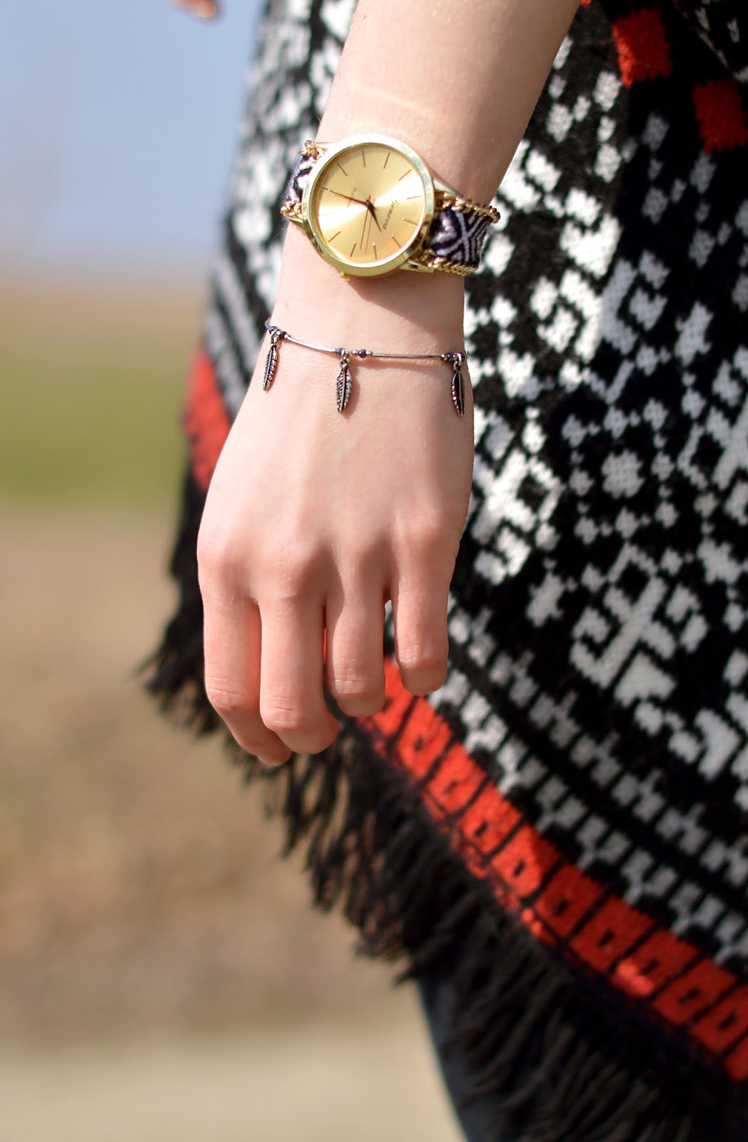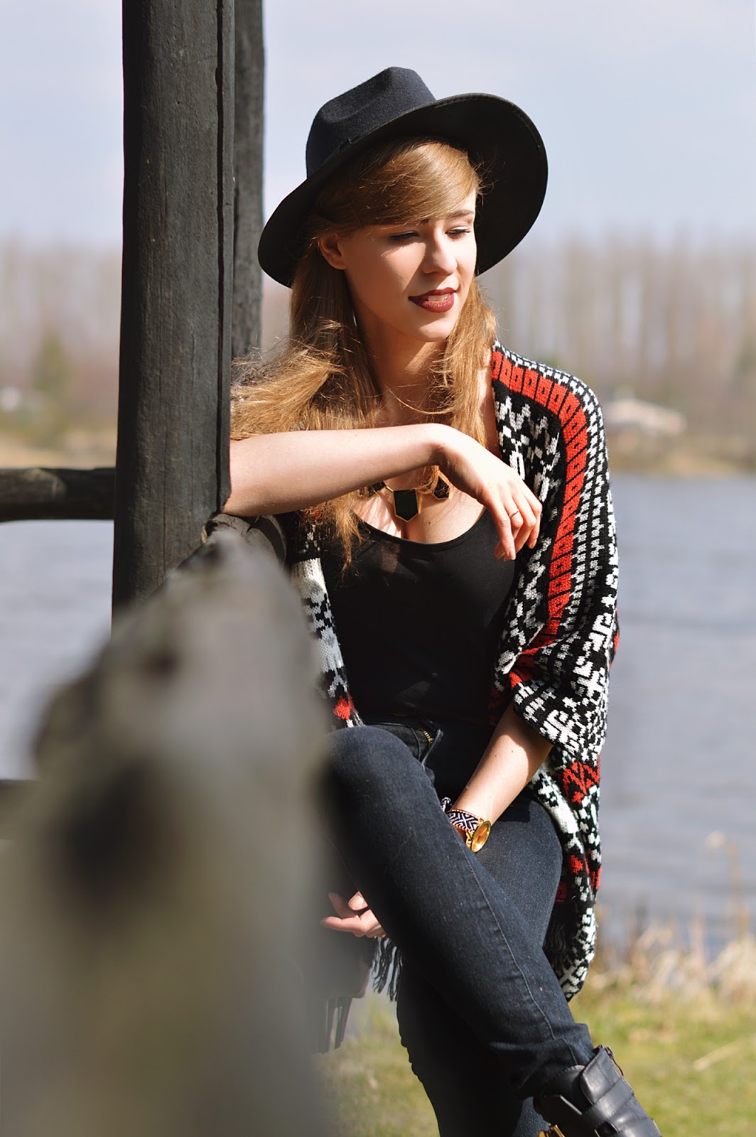 Co do dzisiejszych zdjęć, już od dłuższego czasu nie mogłam doczekać się, aż pogoda pozwoli mi na wrzucenie na siebie tego upolowanego w lumpeksie swetra podszywającego się pod ponczo. Ma świetny krój, piękne kolory i wzór przywodzący na myśl indiańskie plemiona, od których to swoją drogą ponczo właśnie się wywodzi. Kosztował mnie całe 14 zł (o ile dobrze pamiętam) i jest w stanie idealnym. <3