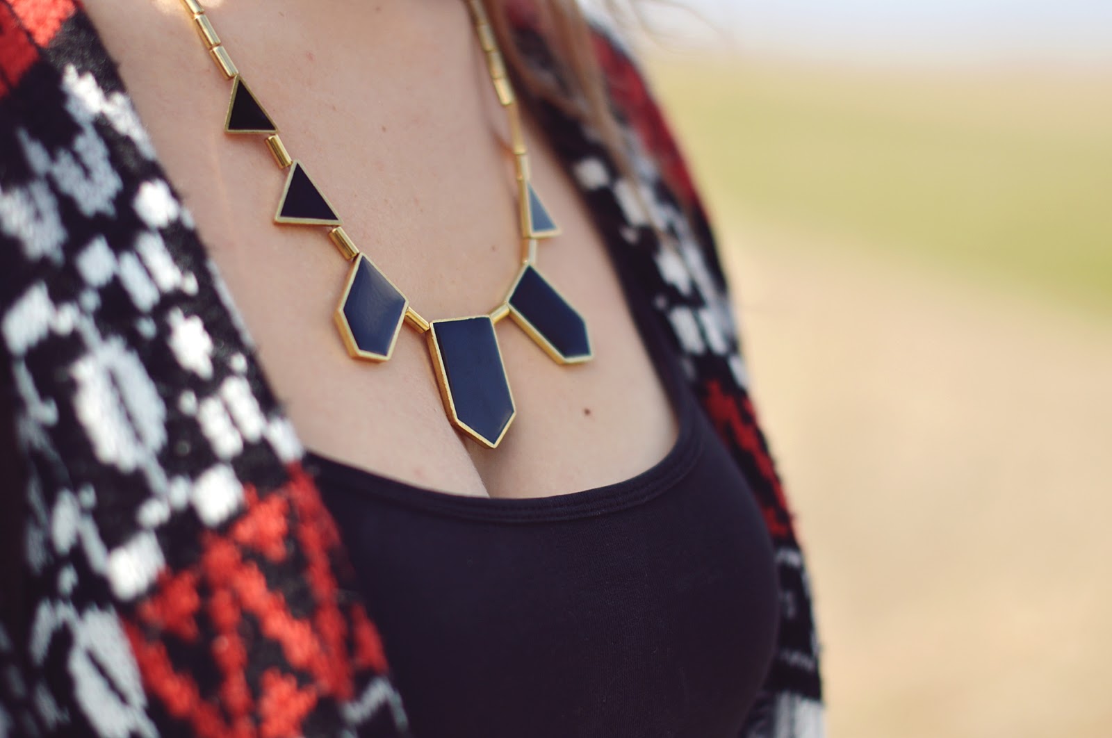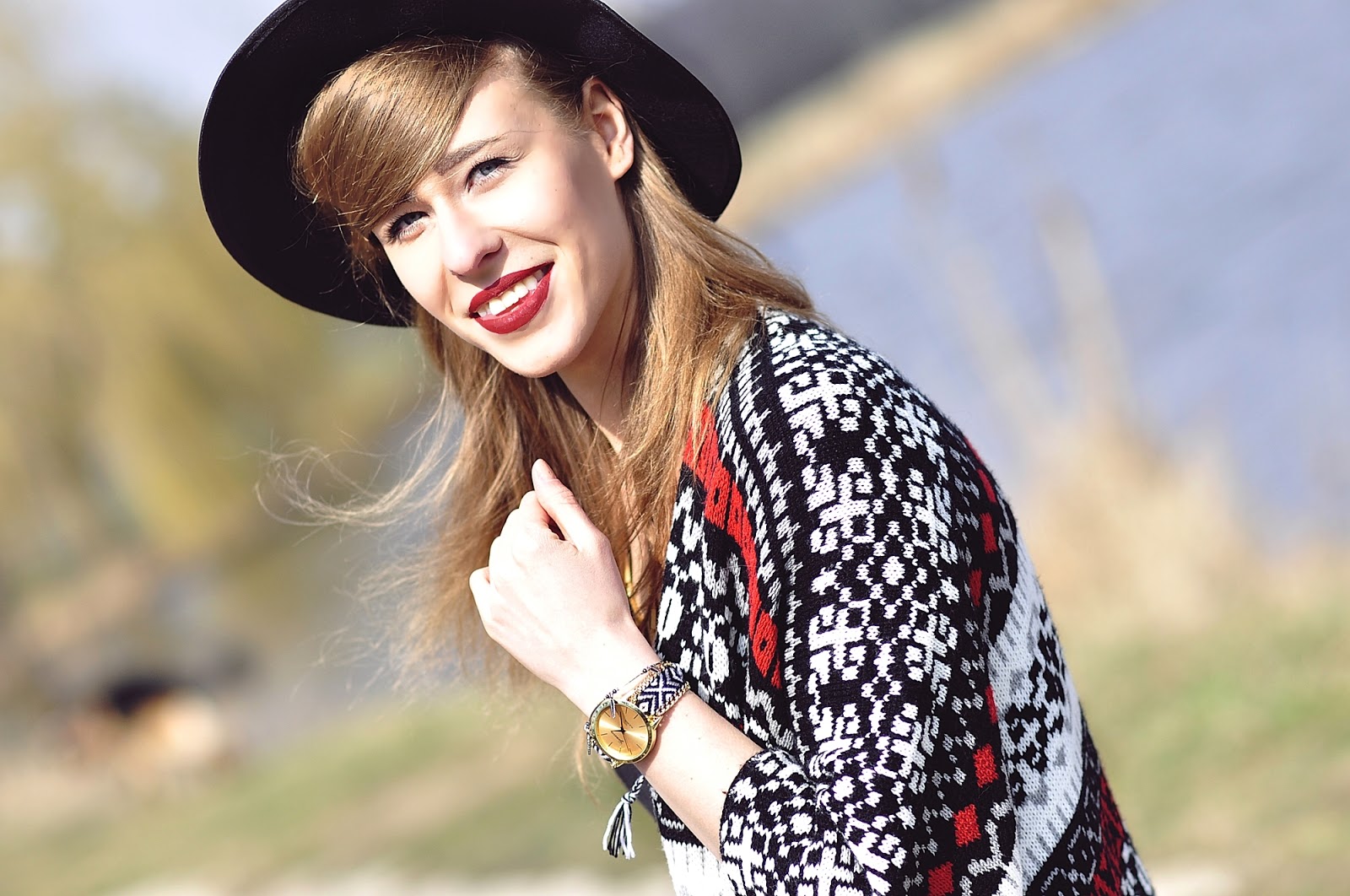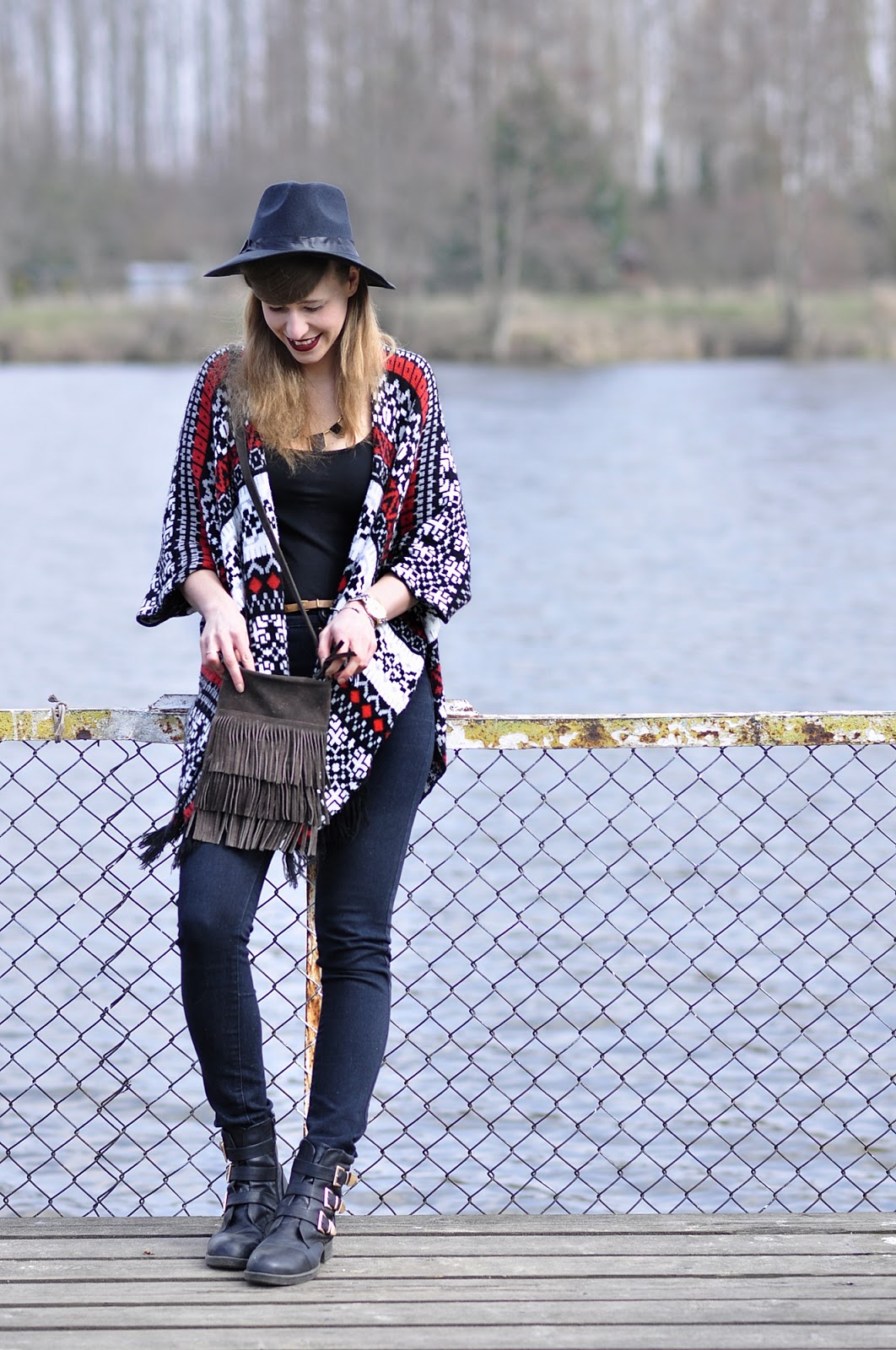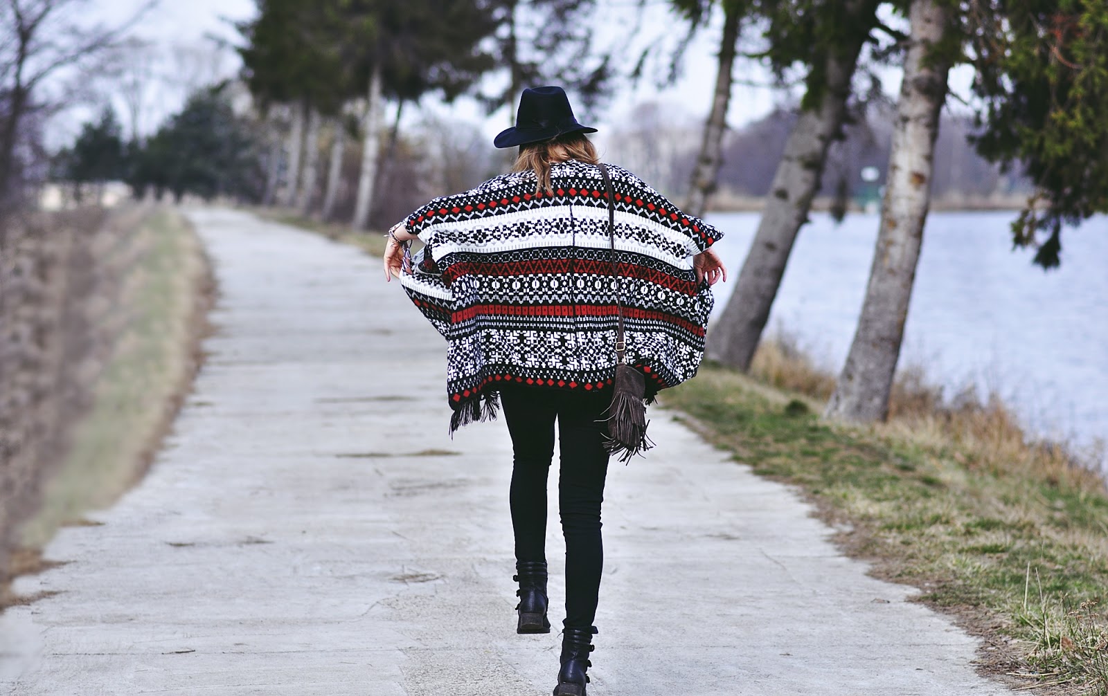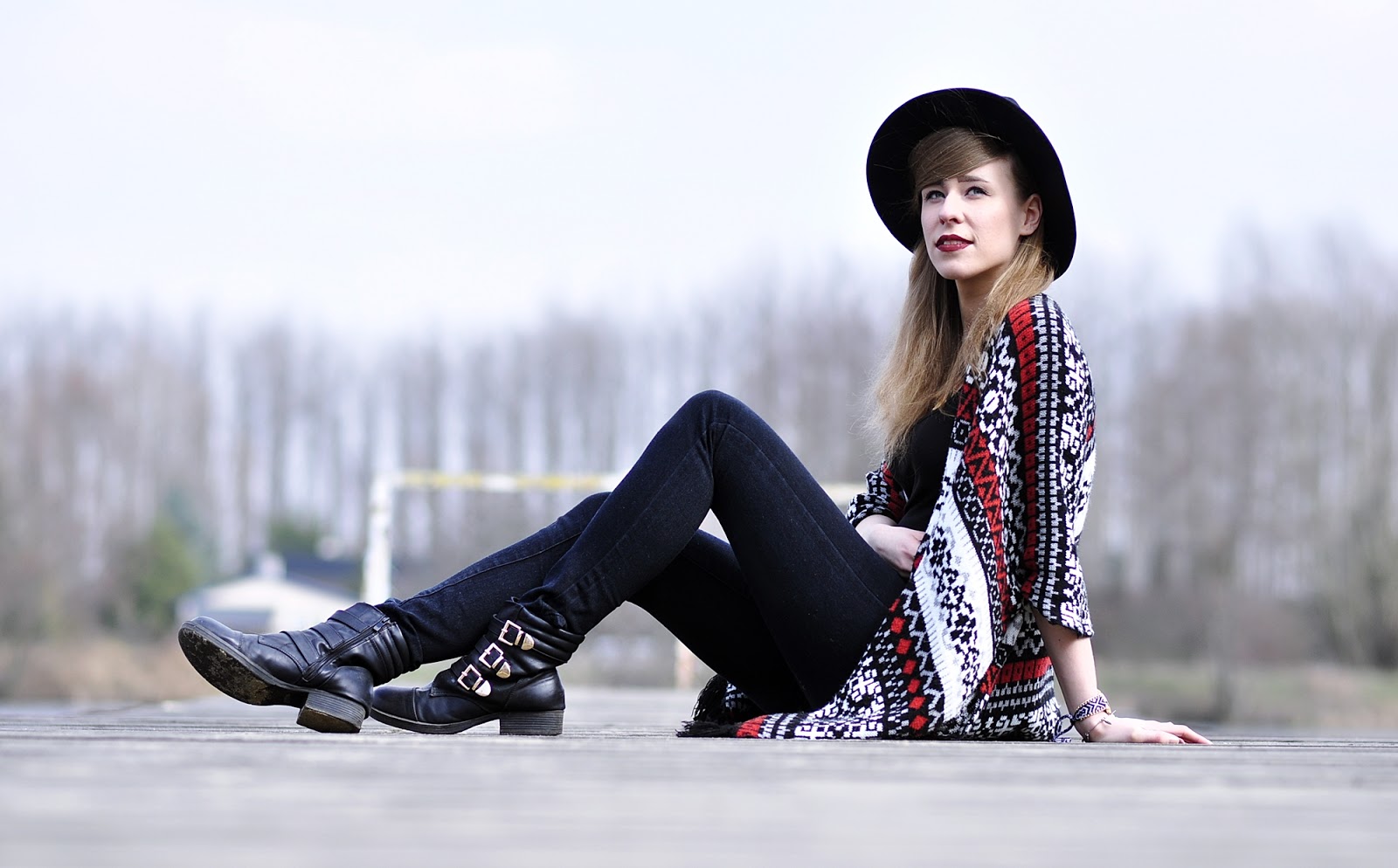 Co do dzisiejszych zdjęć, już od dłuższego czasu nie mogłam doczekać się, aż pogoda pozwoli mi na wrzucenie na siebie tego upolowanego w lumpeksie swetra podszywającego się pod ponczo. Ma świetny krój, piękne kolory i wzór przywodzący na myśl indiańskie plemiona, od których to swoją drogą ponczo właśnie się wywodzi. Kosztował mnie całe 14 zł (o ile dobrze pamiętam) i jest w stanie idealnym. <3