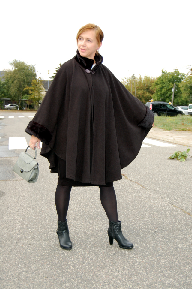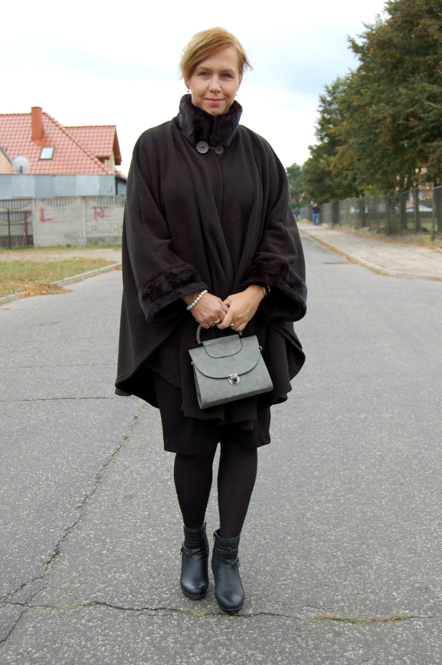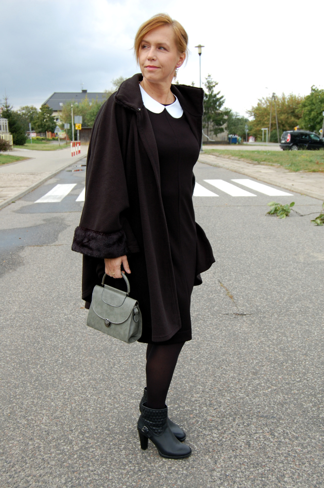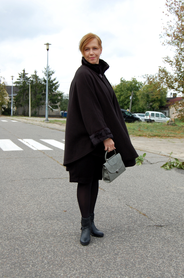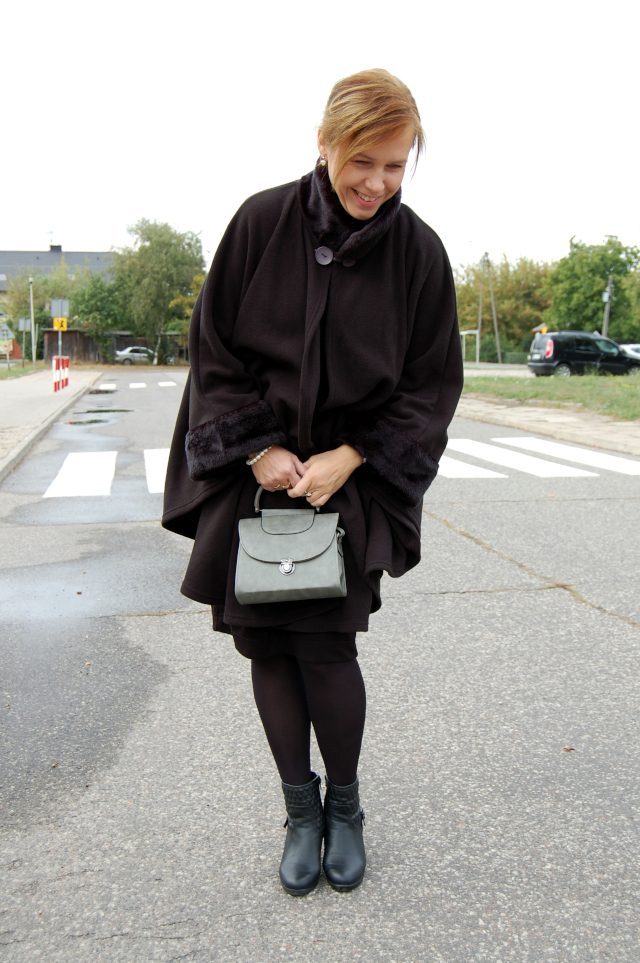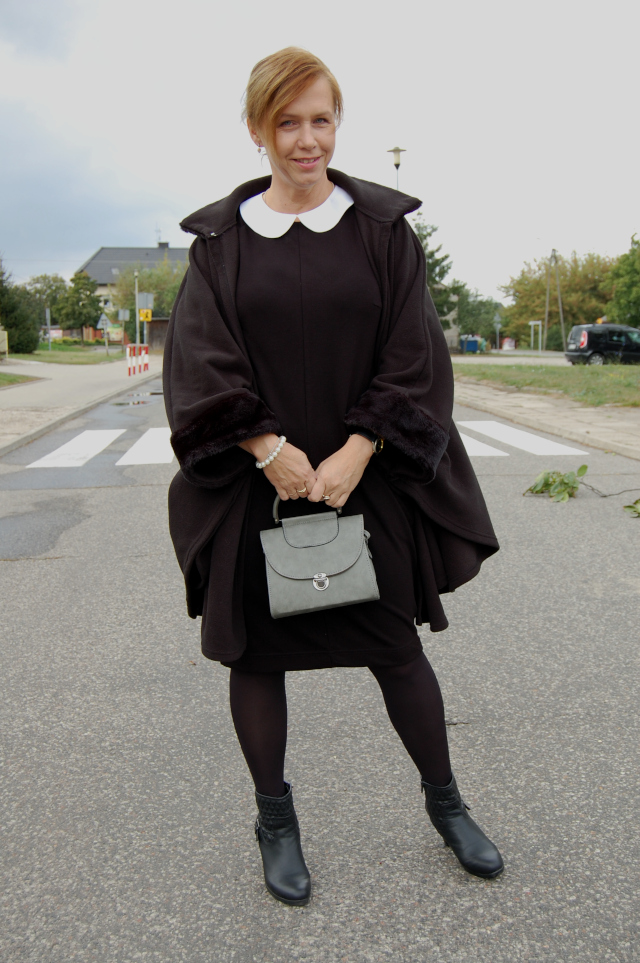 Sukienka-Bonprix, peleryna-nn (sh), botki-Esmara Lidl, kołnierzyk i torebka-Allegro.
