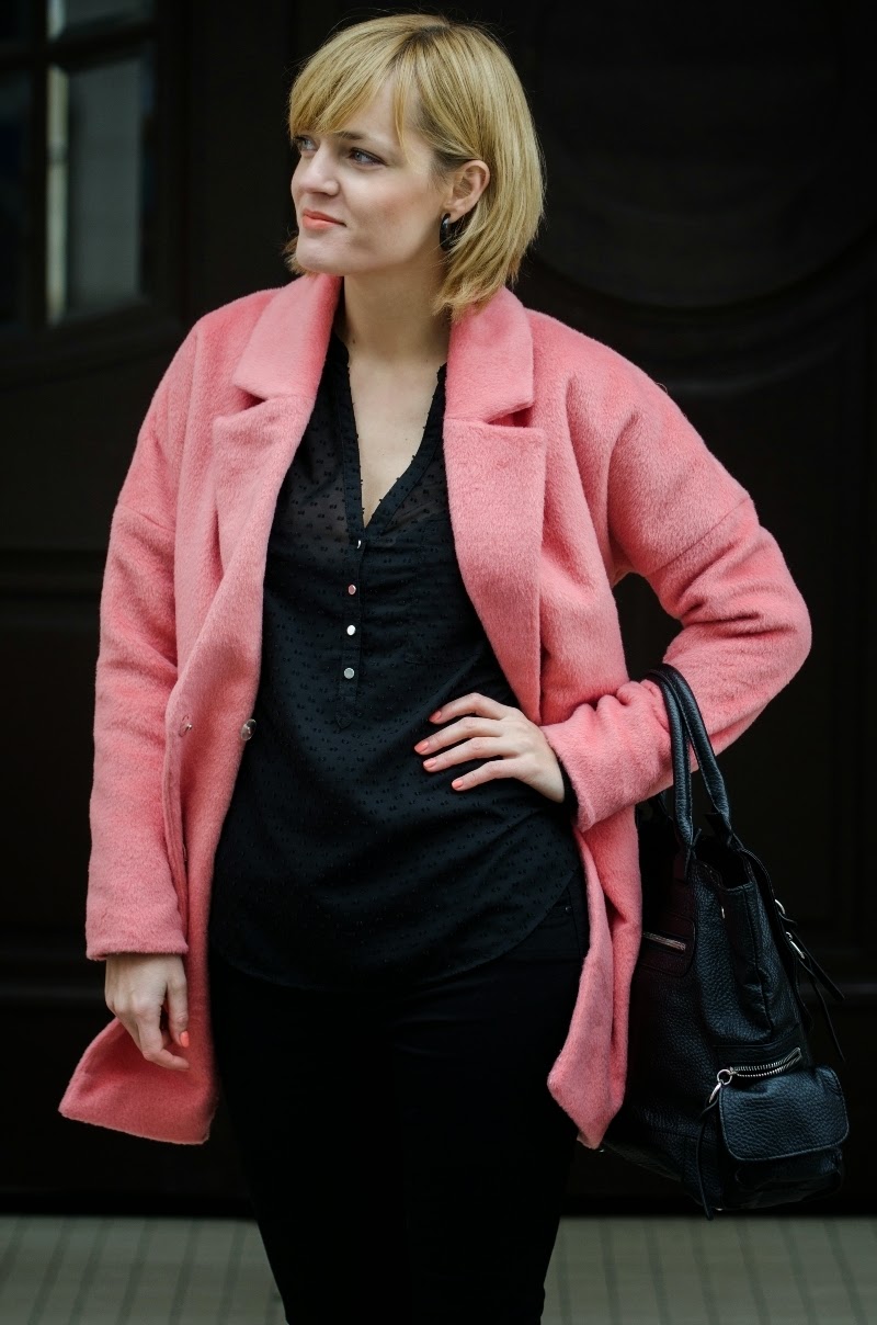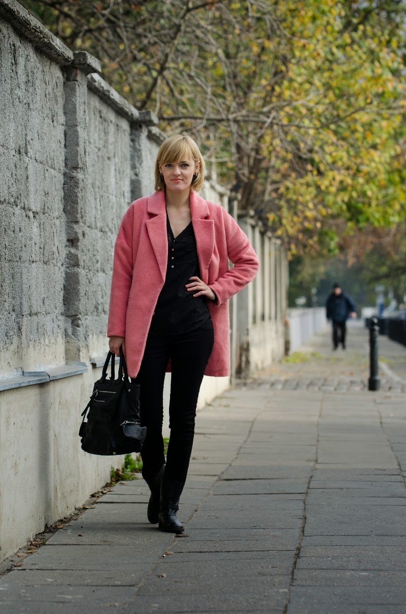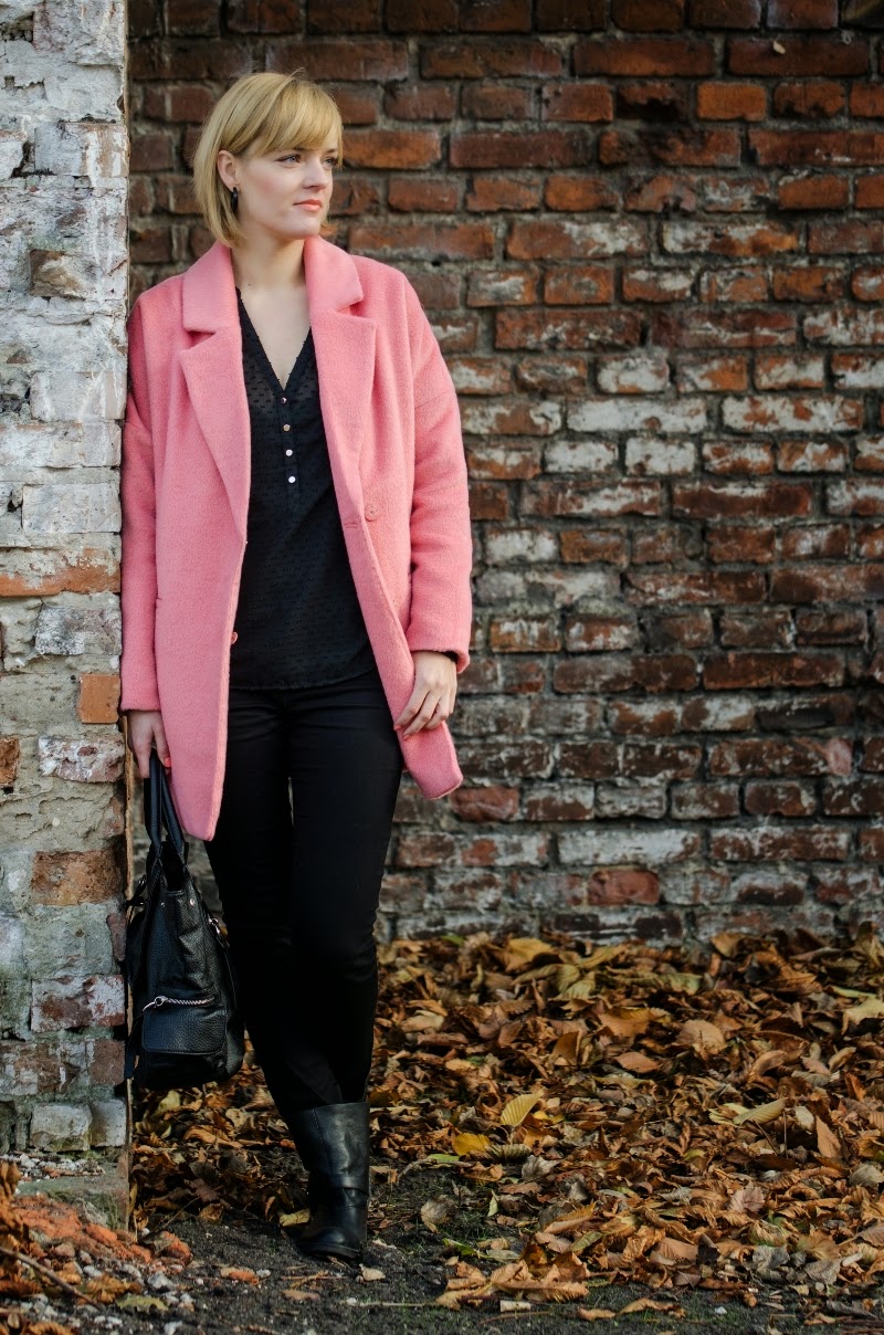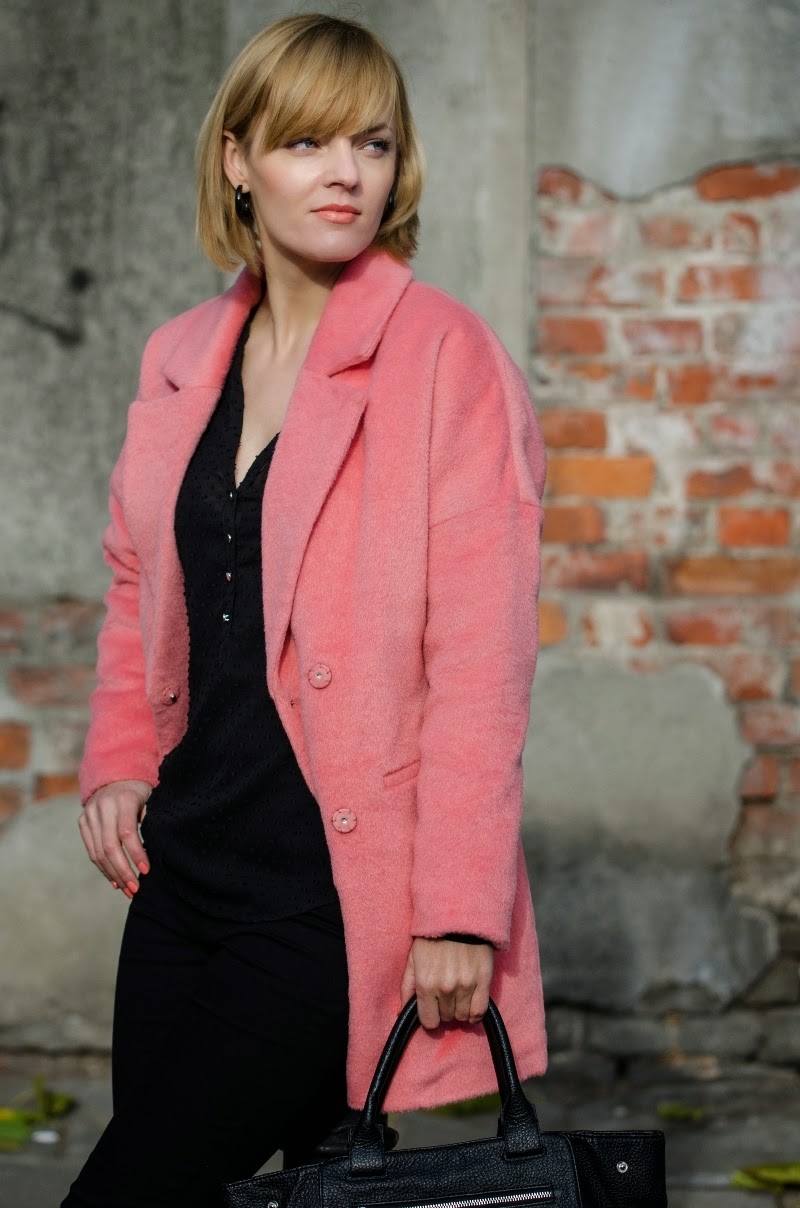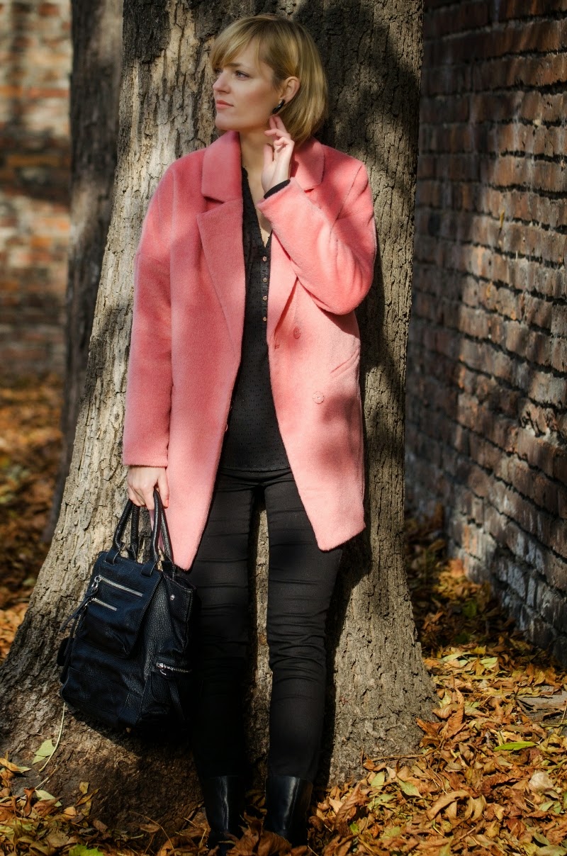 Ten sezon przynosi nam bogactwo bardzo ciepłych, mięciutkich, pluszowych okryć. Oprócz zawsze modnych czarnych możemy wybierać również w weselszych barwach. Moja propozycja to płaszczyk w kolorze łososiowym połączony z czarnymi dodatkami.