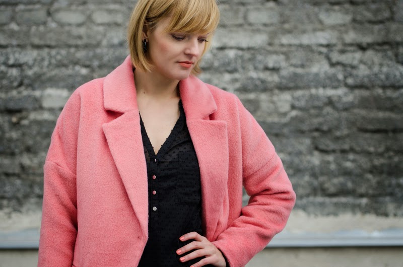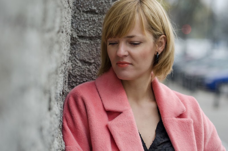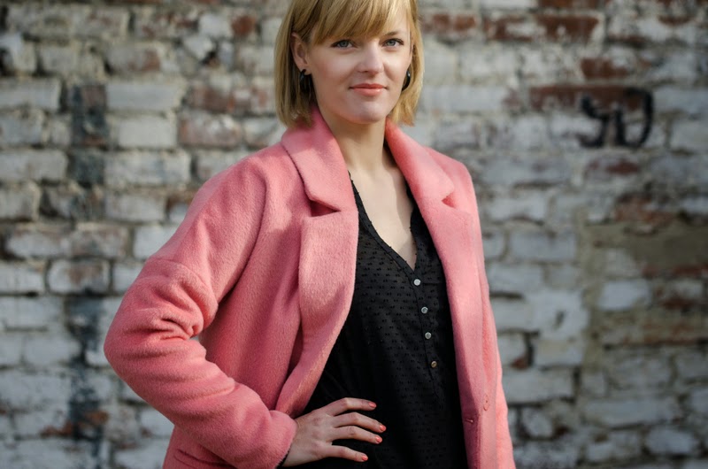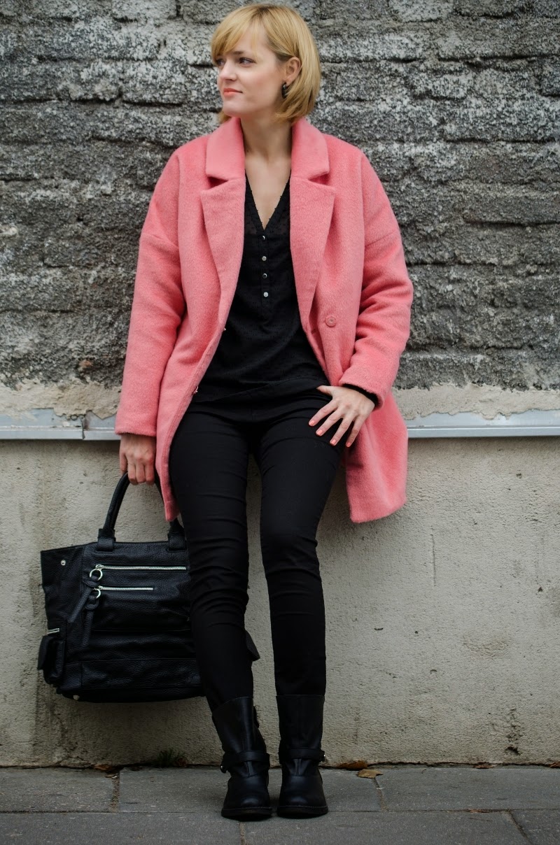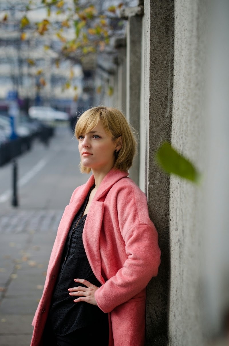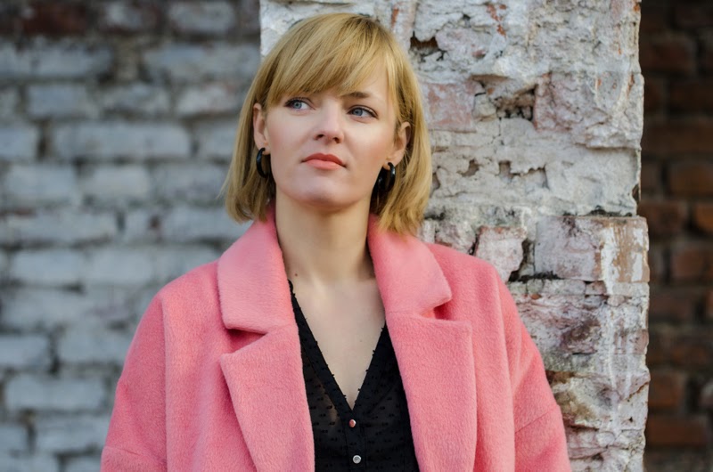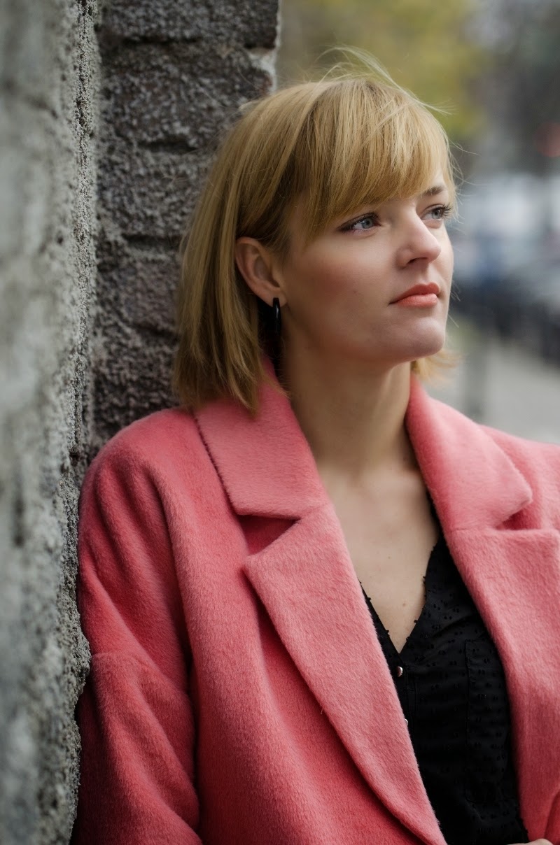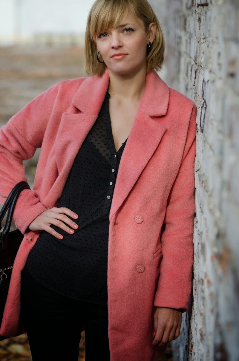 Ten sezon przynosi nam bogactwo bardzo ciepłych, mięciutkich, pluszowych okryć. Oprócz zawsze modnych czarnych możemy wybierać również w weselszych barwach. Moja propozycja to płaszczyk w kolorze łososiowym połączony z czarnymi dodatkami.