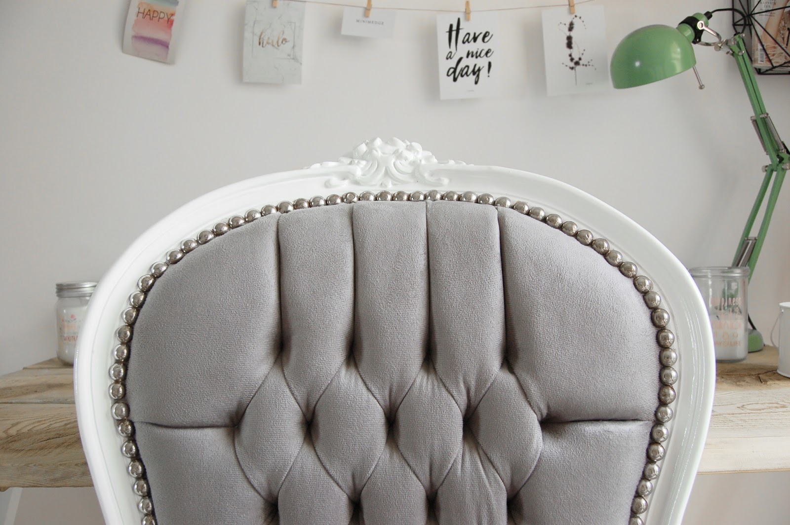 Najbardziej podobają mi się w nim delikatne barokowe (oksymoron!) zdobienia. Nie są ciężkie, nie przytłaczają krzesła, a dzięki temu, że są pomalowane na biało, rozjaśniają wnętrze.