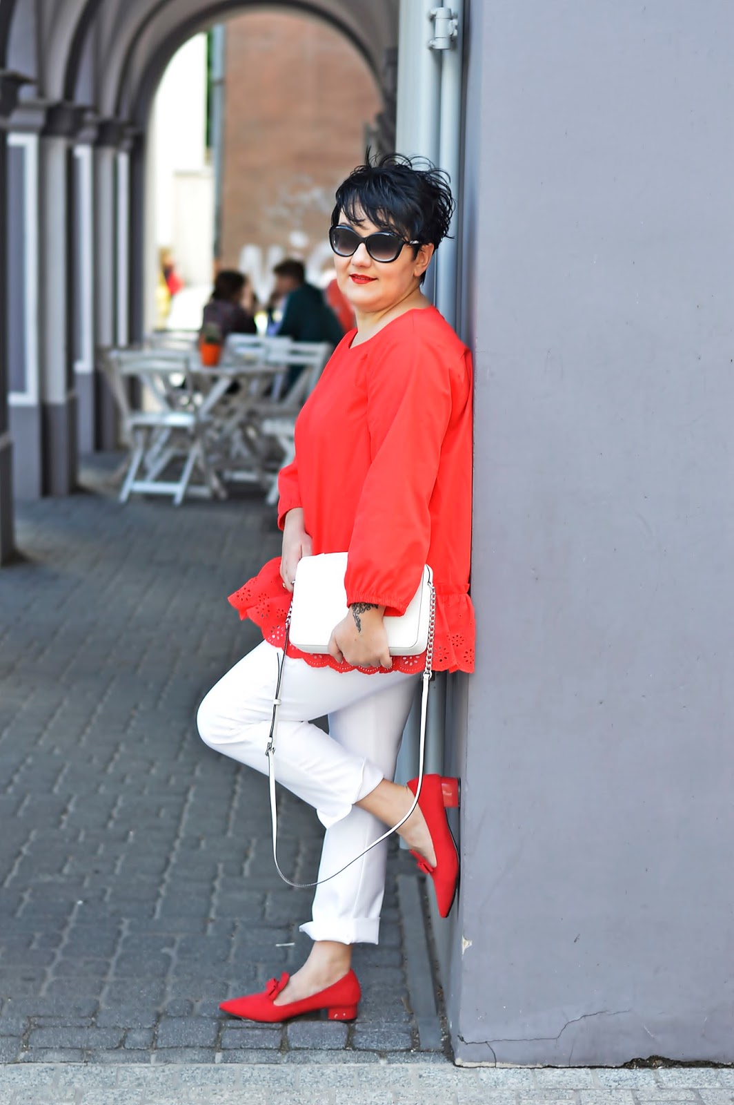 Białe spodnie cygaretki i bawełniana bluzka z haftami tworzą duet idealny na lato. Czerwone buty na obcasie dodały szczyptę elegancji. Można by je z powodzeniem zastąpić półtrampkami i tak wybrać się na zwiedzanie małego, urokliwego miasteczka, np na południu Francji.