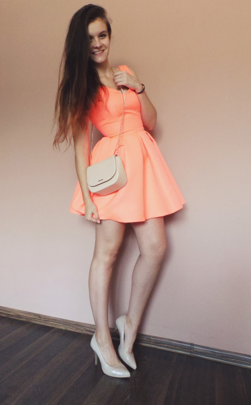 Kolorek jest żarówą. Przepiękna pomarańczowa sukienka.