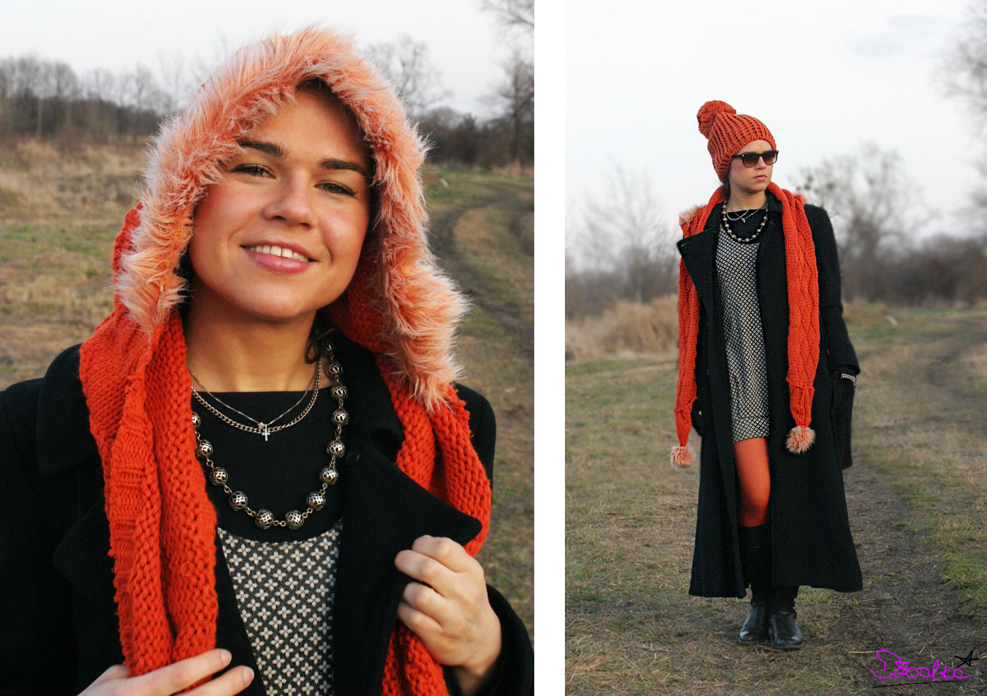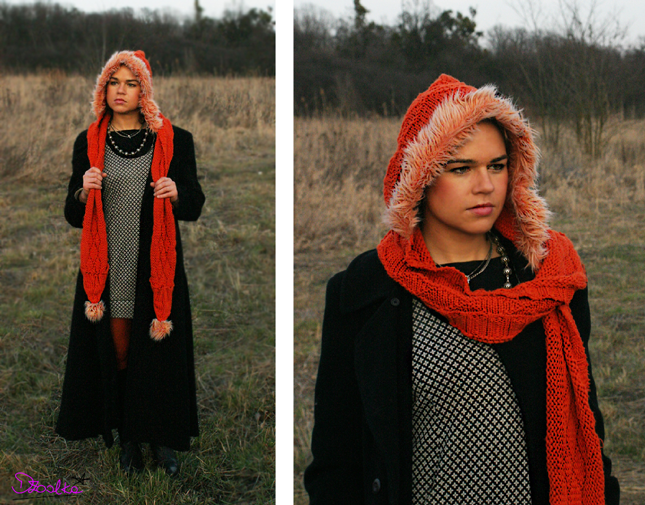 Czapka i pomarańczowy szalik z kapturem doskonale komponują się przy nim z rajstopami. Powiem wręcz, że gdyby nie rajstopy, zbyt wyrazista czapka i szalik z kapturem mogłyby się z płaszczem wręcz gryźć.