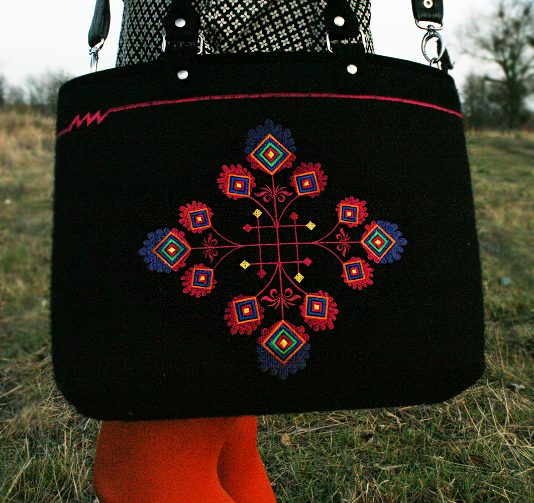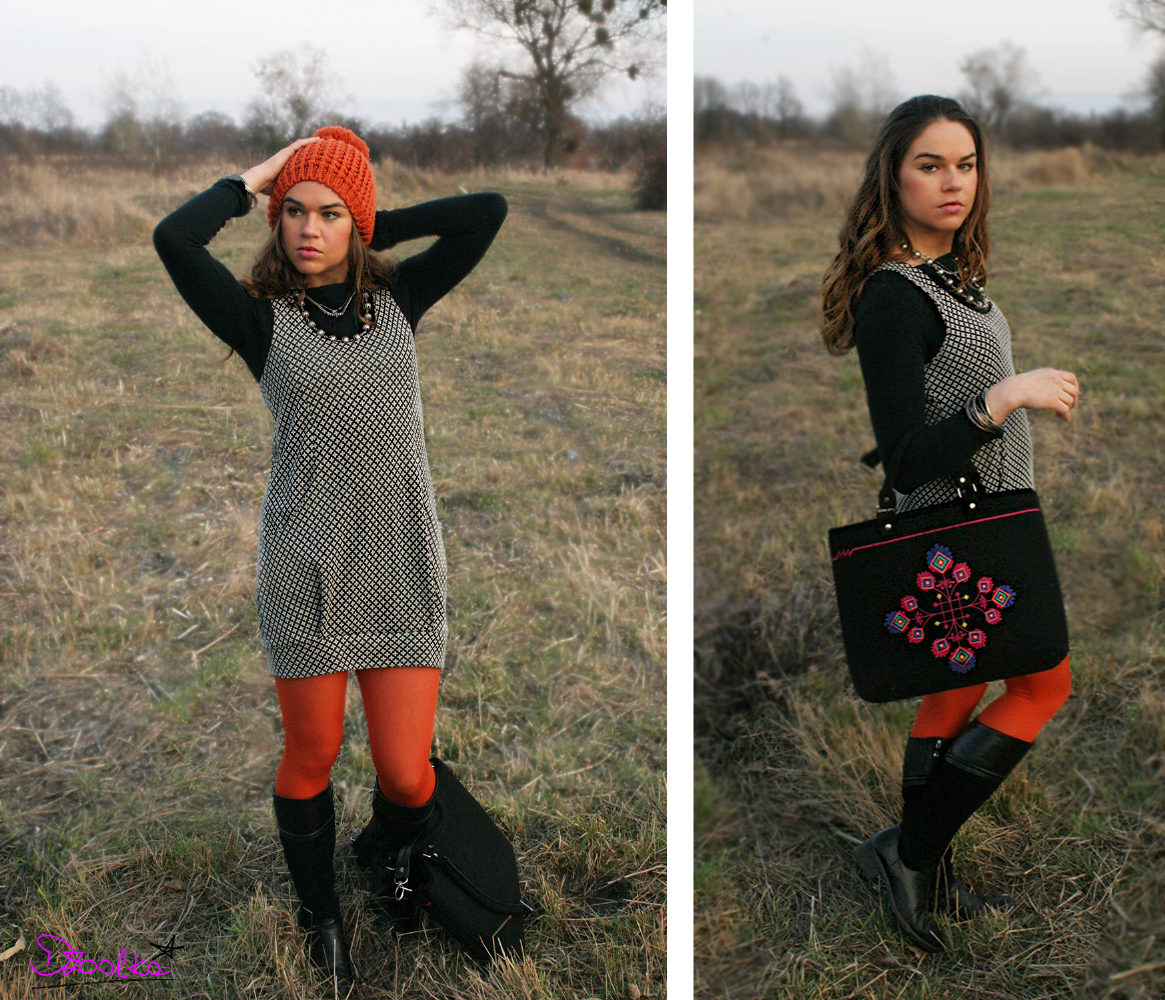 Mówi się, do dobra kompozycja ma maksymalnie 4 kolory. Ja mam na sobie 3, które dodatkowo ożywia wielobarwny wzór na filcowej torbie z folklorystycznym, wyszywanym ornamentem.