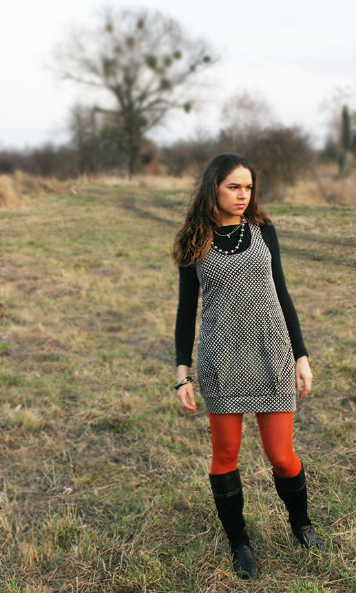 Mam na sobie również szaroburą sukienkę, którą dorwałam na pierwszej imprezie SWAP, którą organizowałam. Sukienka jest ze specyficznego materiału i ma ciekawy, bombkowaty kształt. Idealnie komponuje się praktycznie ze wszystkimi, kolorowymi rajstopami, aczkolwiek mi najbardziej pasują do niej te w ciepłych kolorach.