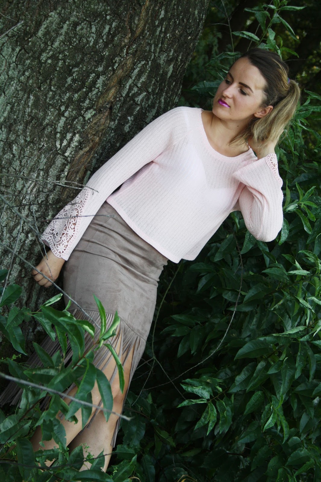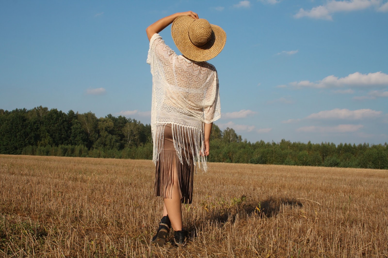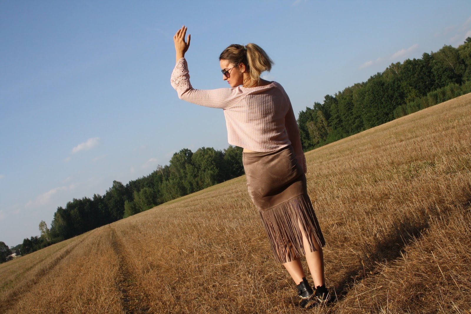 Zobacz oryginał pt., 04/11/2016 - 17:19Hi!Przedstawiam2stylizacje.Pożegnałam letnie rzeczy.Szorty i krótkie bluzeczki niech czekają do lata.Na zdjęciach uchwyciłyśmy jeszcze ciepły,słoneczny dzień.W poszukiwaniu jesiennych ubrań udało mi się upolować w sklepie Bershka krótki,pudrowy sweterek z rozszerzanymi,koronkowymi rękawami.Nowością jest również zamszowa spódnica z frędzlami.W2stylizacji jest narzutka z frędzlami oraz słomiany kapelusz w stylu boho.Które połączenie Wam się podoba?Zapraszam do oglądania!