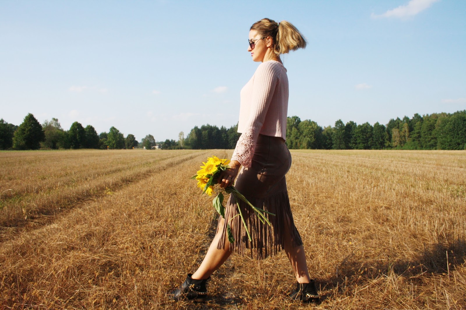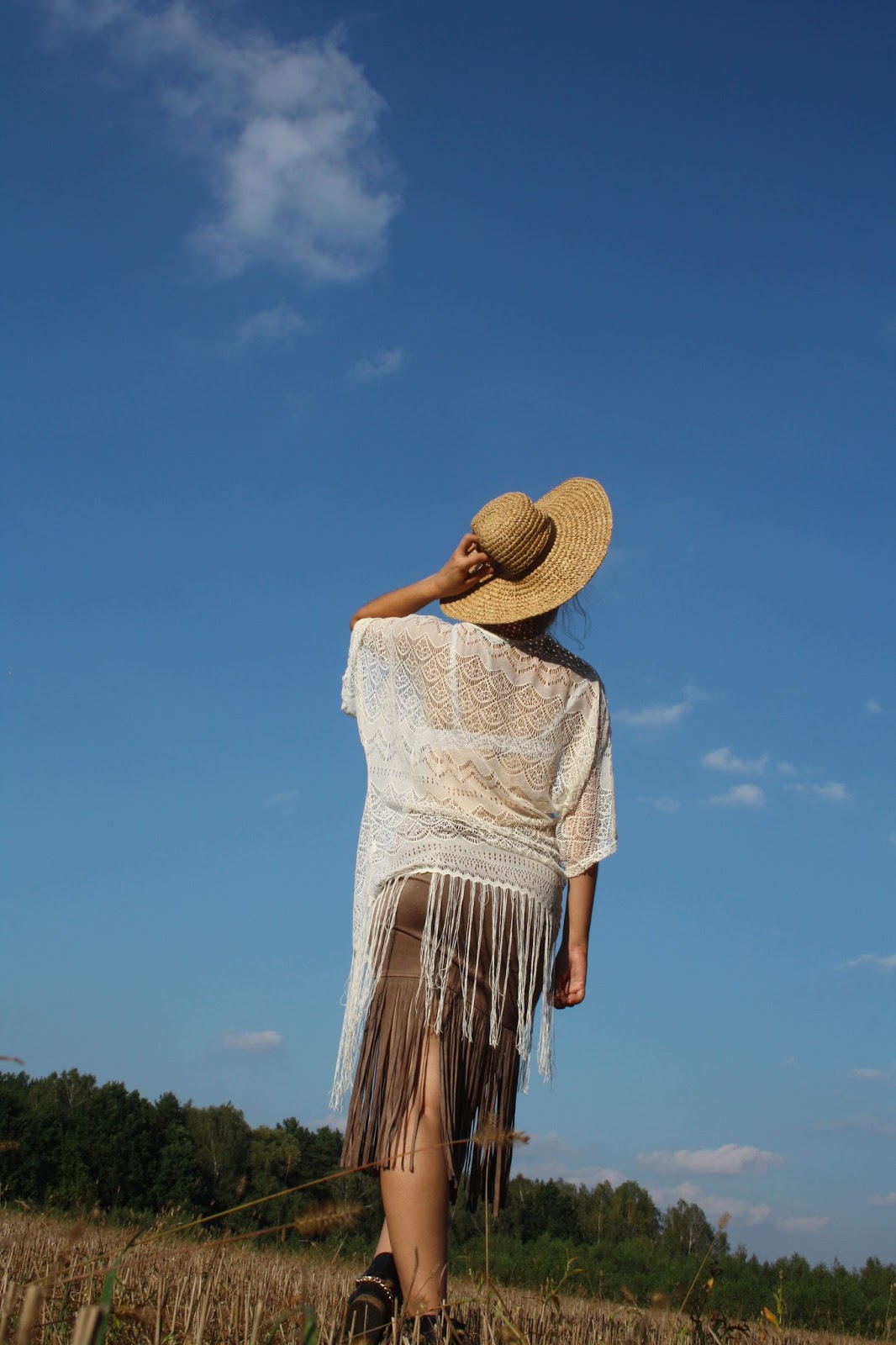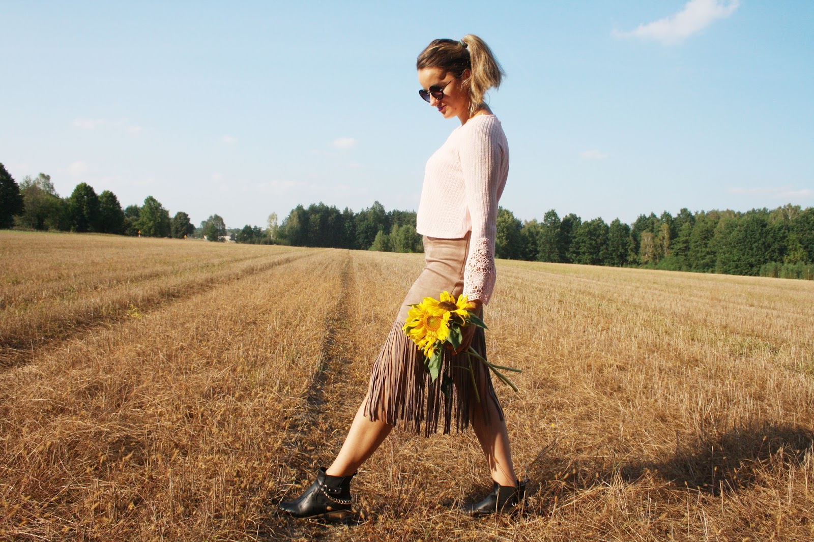 Zobacz oryginał pt., 04/11/2016 - 17:19Hi!Przedstawiam2stylizacje.Pożegnałam letnie rzeczy.Szorty i krótkie bluzeczki niech czekają do lata.Na zdjęciach uchwyciłyśmy jeszcze ciepły,słoneczny dzień.W poszukiwaniu jesiennych ubrań udało mi się upolować w sklepie Bershka krótki,pudrowy sweterek z rozszerzanymi,koronkowymi rękawami.Nowością jest również zamszowa spódnica z frędzlami.W2stylizacji jest narzutka z frędzlami oraz słomiany kapelusz w stylu boho.Które połączenie Wam się podoba?Zapraszam do oglądania!