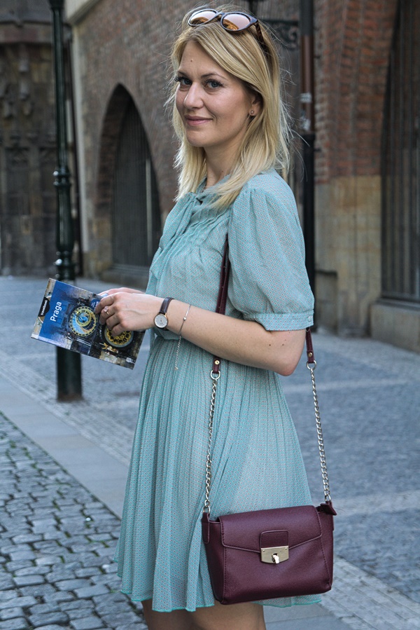 Przy okazji pobytu w Pradze pokażę Wam również trzy stylizacje. Pierwszego dnia wybrałam zieloną sukienkę w czerwone kropki z fontaziem przy szyi. Uzupełniłam ją bordową torebką oraz butami na słupku w kolorze butelkowej zieleni ze złotą wstawką. Tego dnia nie planowaliśmy kilometrowych wycieczek więc pozwoliłam sobie na wyższy obcas.