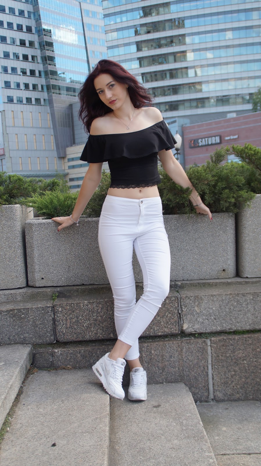Zobacz oryginał pt., 17/06/2016 - 11:30 Moja pierwsza stylizacja prezentuje się bardzo dobrze we wiosennym okresie, który teraz panuje i idealnie pasuje do wielkomiejskiego zgiełku. Będąc w tym stroju czuję się pewnie i kobieco. Krótka bluzka doskonale podkreśla talie, bardzo dobrze komponuje się ze spodniami z wysokim stanem. Uważam, że połączenie bieli i czerni wygląda bosko. Nike Air Max to moje ulubione buty, są mega wygodne i jestem pewna, że jeszcze nie raz pojawią się w moich stylizacjach, ponieważ pasują do większości rzeczy.