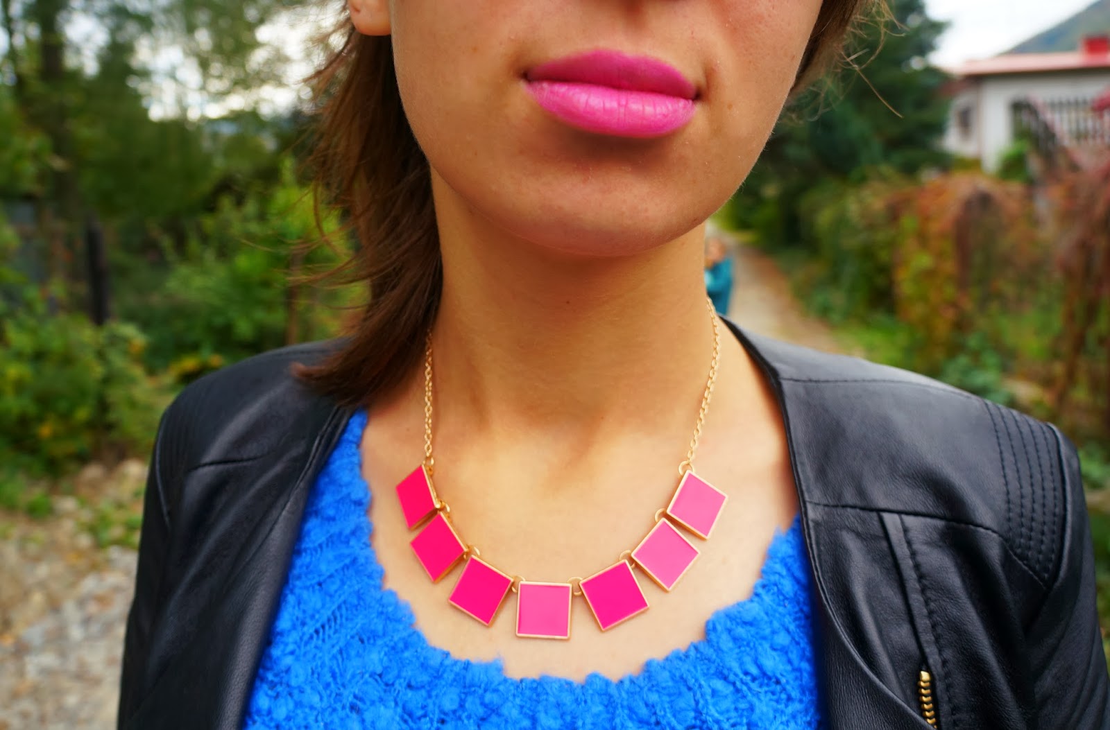 Różowe usta + różowy naszyjnik + chabrowy sweter.
