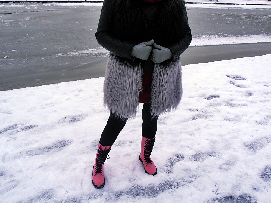 Cóż na początek, kamizelka ONLY którą zakupiłam jeszcze będąc w Irlandii, szarości połączyłam z odcieniami różu i fuksji. Oczywiście nie mogło zabraknąć moich kochanych Dr Martens :) Dziś kalosze, zaczęła się lekka odwilż więc pomyślałam, że będzie idealnie :)