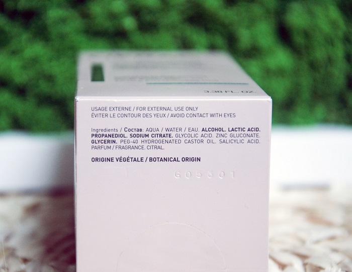 Skład INCI: Aqua, Alcohol, Lactic Acid, Propanediol, Sodium Citrate, Glycolic Acid, Zinc Gluconate, Glycerin, PEG-40 Hydrogenated Castor Oil, Salicylic Acid, Parfum.