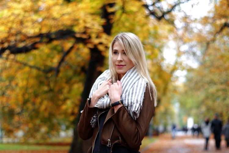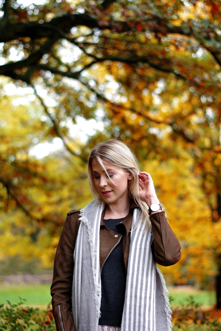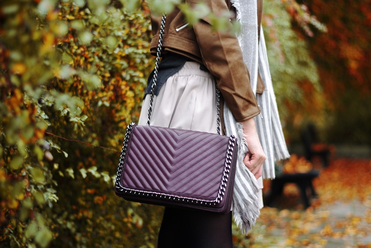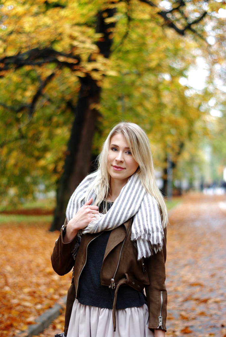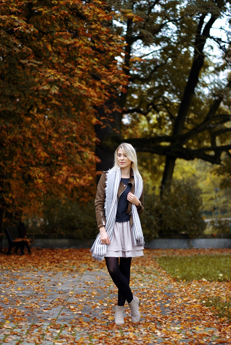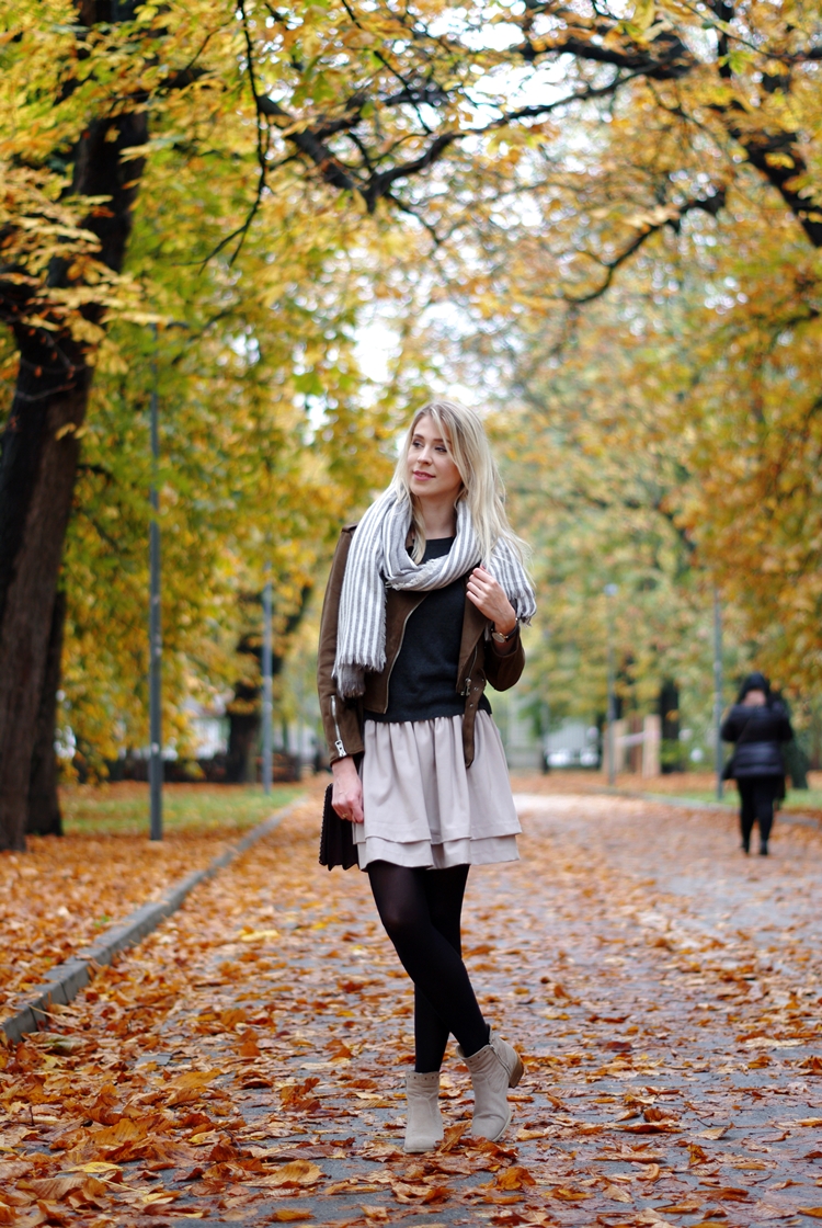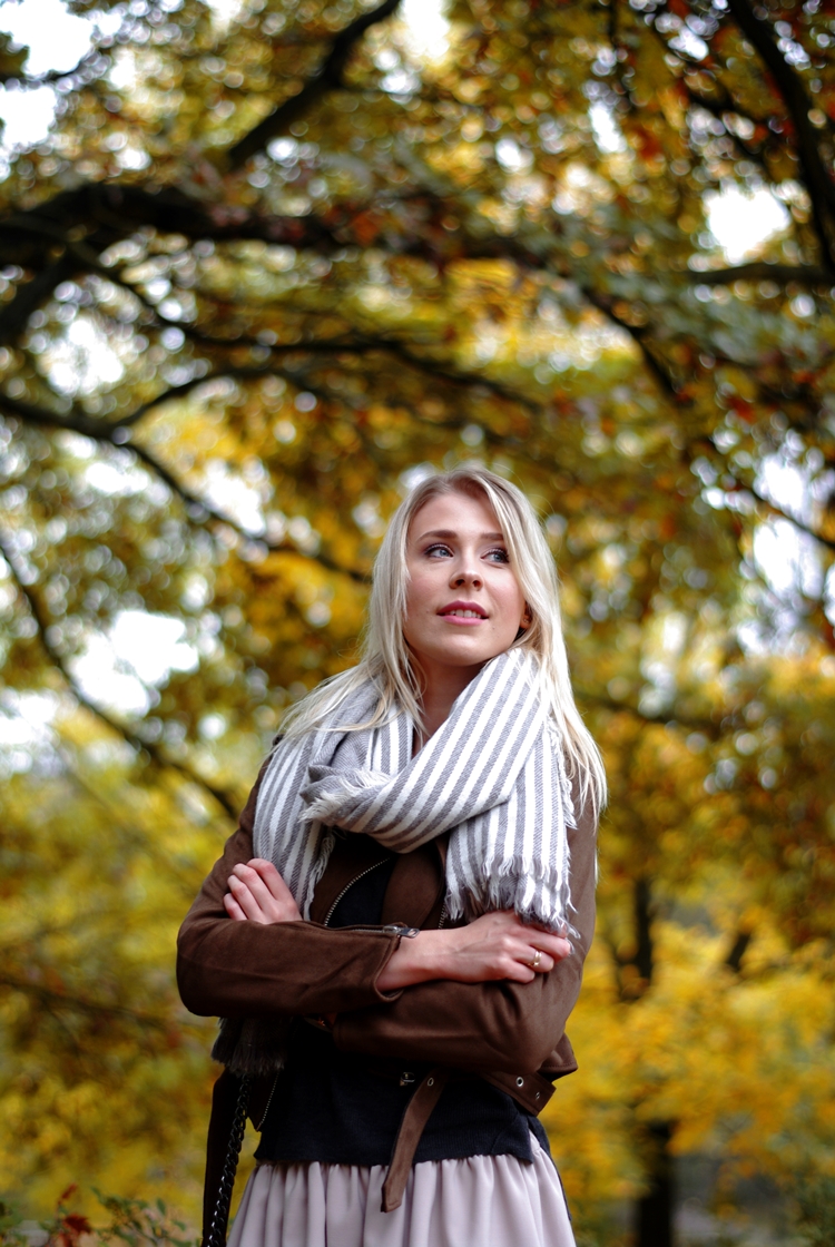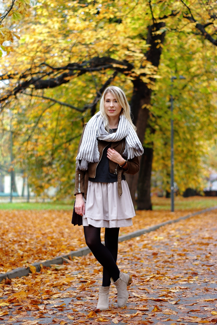 Zobacz oryginał czw., 26/10/2017 - 20:20Dzisiaj zapraszam Was na jesienny spacer :) Rzadko udawało mi się złapać na zdjęciach polską, złotą jesień. Zawsze zamieniała się w brzydką pluchę, a temperatury odstraszały. Na szczęście w tym roku jest inaczej, a ja korzystam jak mogę! :) Odkąd brązowa ramoneska zawitała do mojej szafy, to mogłabym ją nosić codziennie. Świetnie komponuje się z jesienną garderobą i dodatkami. To ciekawa alternatywa dla czarnej kurtki. Jeśli zastanawiacie się nad kupnem, to nie ma na co czekać. To będzie dobra inwestycja. Jesienią pod płaszcz, a wczesną wiosną jako okrycie wierzchnie. Gwarantuję Wam, że pomysłów na stylizacje będzie mnóstwo. Moja dzisiejsza propozycja to bardzo dziewczęcy i prosty strój na co dzień. Kto powiedział, że zwiewne spódniczki można nosić tylko latem? Przy odpowiedniej oprawie, sprawdzą się także w zimniejsze dni. Spróbujcie! :)