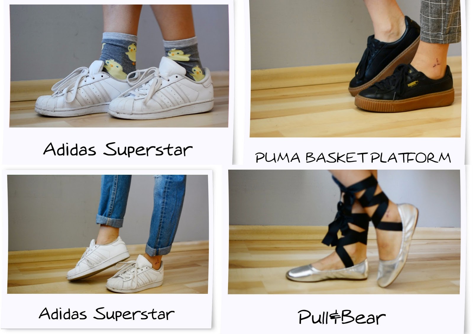Przed stworzeniem moich czterech outfit'ów pomyślałam, iż warto było by przygotować takie komplety, do których pasować będą różne typy butów. Oczywiście, nie znajdziecie tutaj letnich sandałków, ze względu na nie sprzyjające już warunki pogodowe, czy botków na wysokim koturnie, gdyż w szkole wygodę cenię sobie na pierwszym miejscu. Postawiłam przede wszystkim na wygodne butki sportowe, ale nie zapomniałam również o czymś bardziej dziewczęcym, a przy okazji ostatnio dosyć modnym. Srebrne balerinki z czarnymi wstążkami to prawdziwy hit tej jesieni, który nie tylko wygląda spektakularnie, ale również bardzo delikatnie, ze względu na duże podobieństwo tych butów do baletek. Białe Adidas Superstar, ze zdjęcia numer jeden najlepiej wpasowały mi się w pierwszy outfit, natomiast te same buciki, ale w wersji bez skarpet w śmieszne kurczaczki dobrze wyglądają ze stylizacją numer trzy. Ulubione czarne Pumy dopasowałam do outfit'u drugiego, a ostatnia stylizacja, z uroczą ogrodniczką dostąpiła zaszczytu dobrania srebrnych balerinek.