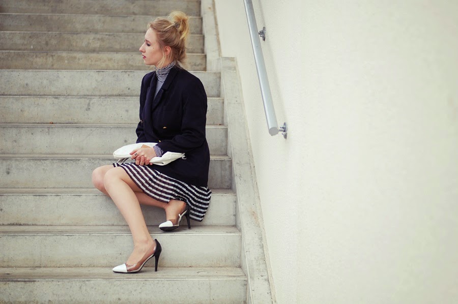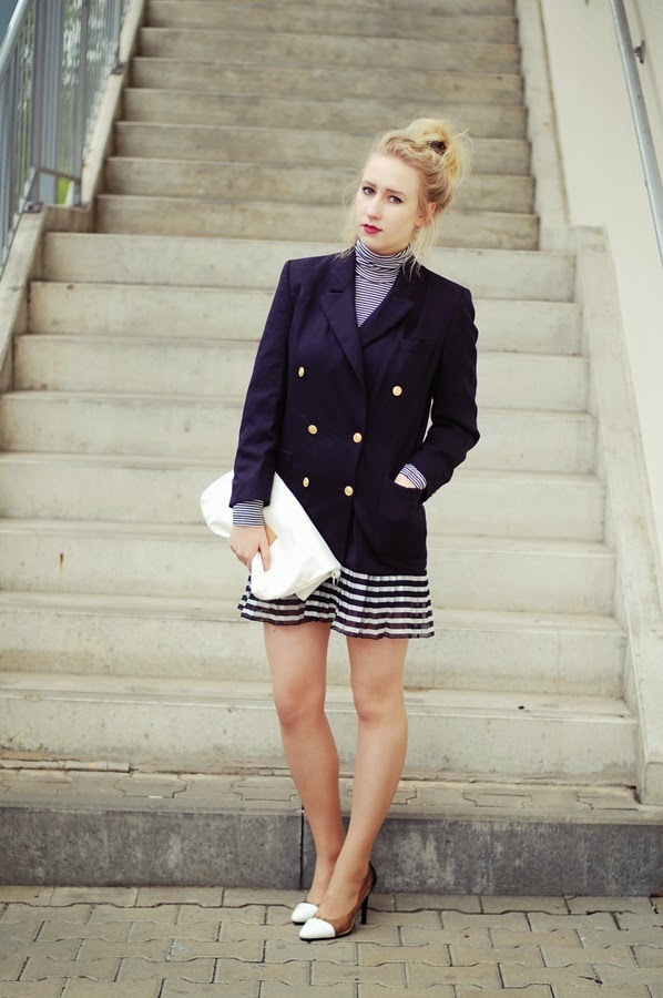 Zobacz oryginał pt., 27/06/2014 - 18:42Uwielbiam obserwować modę uliczną, szczególnie kiedy podróżuję po innych miastach. Wtedy mam okazję poznać różne zestawienia kolorów tkanin, które wcześniej były mi obce i nieznane . Tak było w przypadku stylu marynarskiego. Nigdy nie mogłam się do niego przekonać i kiedy jakiś czas temu był " super modny" ja przechodziłam obok niego obojętnie. Jednak ostatnio będąc w second handzie w moje ręcę wpadła dwurzędowa marynarka, która od razu skradła moje serce, a cena jednej złotówki jeszcze bardziej zachęciła mnie do zakupu. Oczywiście o tym, co dla was przygotowałam w stu procentach, nie można powiedzieć, żeby było bardzo marynarsko, jednak chciałam zinterpretować to na swój indywidualny sposób. Pogoda ostatnio płata nam figle, ja już kilka tygodni temu wyciągnęłam szorty, a na dworze temperatury wymuszające na nas wyciągniecie kurtek. Powracam do was w końcu z wersją w szpilkach, nogi są prawie wygojone, więc mogę dla was działać