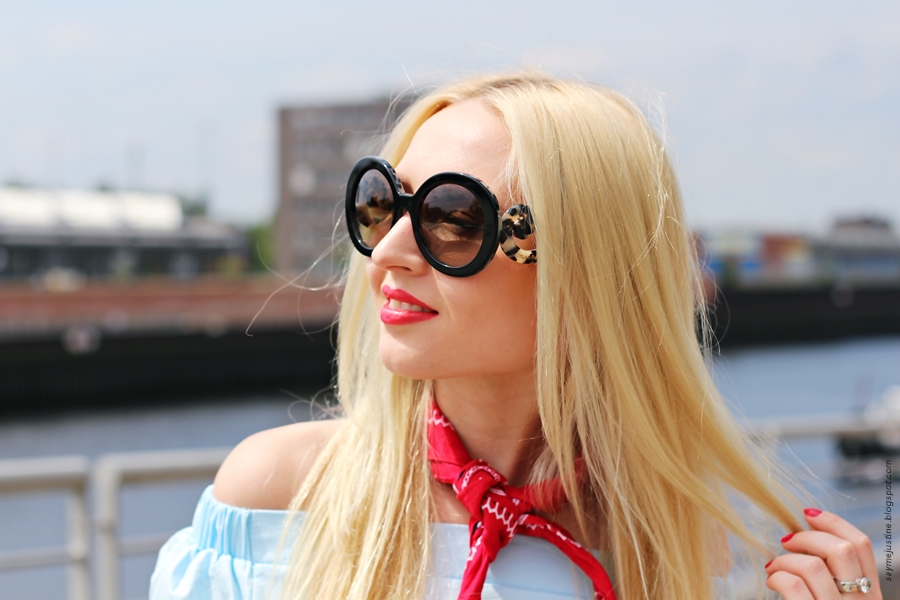 Off-Shoulder Trend ist einer meiner Lieblingstrends in dieser Saison, was ihr schon in diesem Post --> click erfahren konntet. Blusen und Kleider mit Carmen-Ausschnitt kann man fast überall finden, oft sind sie mit Rüschen, Gummibänder und Spitze verschönert, also ist es etwas für Fans von femininen Schnitten :) Der nächste Hit dieses Sommers sind Halstücher, bei so einem großen Ausschnitt ersetzen sie super den Schmuck und gleichzeitig peppen sie den ganzen Look auf, meine rote Bandana passt super zu den anderen Accessoire. So ist mein Tagesoutfit entstanden, elegant und locker in einem, so wie ich es mag :)